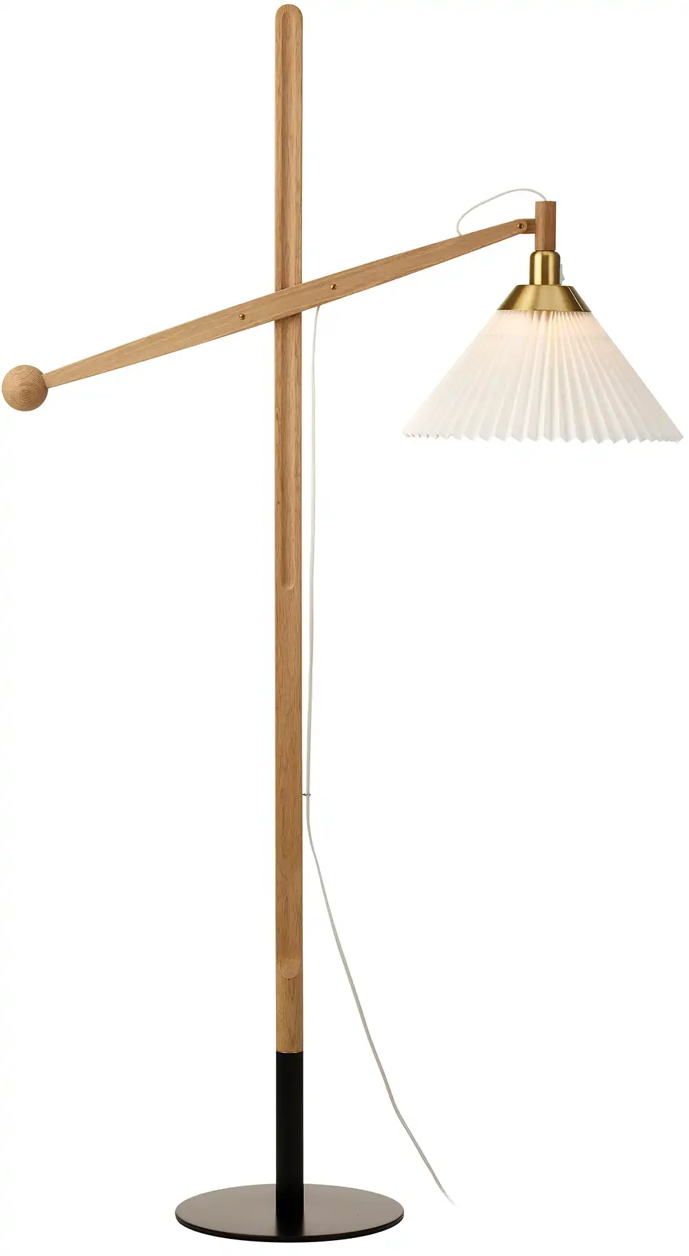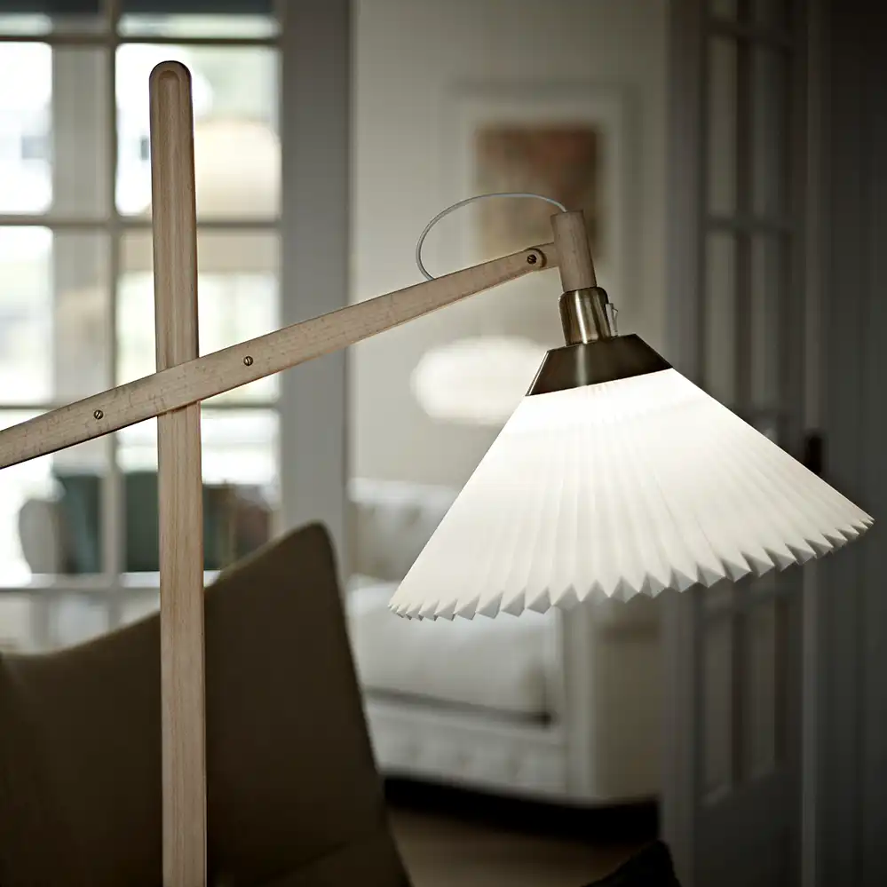 Die Stehleuchte Modell 325 wurde 1957 vom dänischen Architekten Vilhelm Wohlert entworfen und zählt heute zu den Klassikern des skandinavischen Leuchtendesigns. Gefertigt aus heller Eiche, überzeugt sie durch ihre klare Formensprache und hochwertige Verarbeitung. Der verstellbare Querarm sowie der schwenkbare, handgefaltete Lampenschirm ermöglichen eine flexible Ausrichtung des Lichts. Dadurch eignet sich die Leuchte besonders gut für Leseecken, Wohnräume oder Arbeitsbereiche. Das diffuse Licht des Schirms sorgt für eine angenehme, warme Beleuchtung und trägt zu einer wohnlichen Atmosphäre bei
