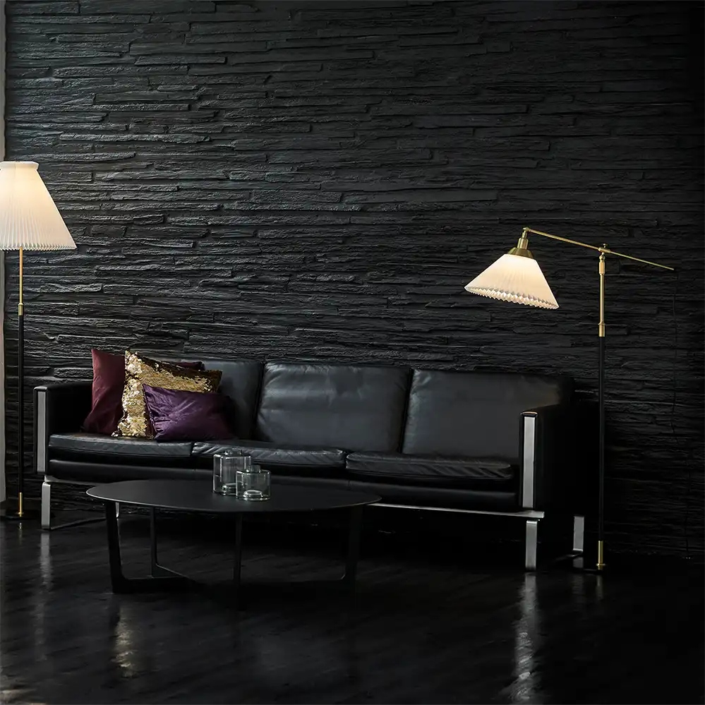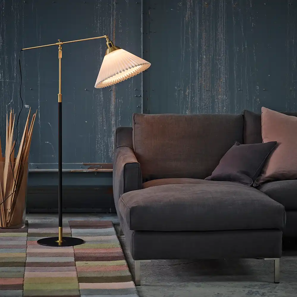 Die Modell 349 Stehleuchte, entworfen von Aage Petersen im Jahr 1946, ist ein funktionaler Designklassiker mit klarer Formsprache. Gefertigt aus Messing, kombiniert sie hochwertige Materialien mit durchdachter Technik. Der höhenverstellbare Lampenstamm lässt sich flexibel zwischen 113 und 158 cm anpassen und eignet sich damit für unterschiedliche Raumgrößen und Nutzungssituationen. Der neigbare Lampenschirm ermöglicht eine gezielte Lichtausrichtung – ideal für den Einsatz als Leselampe.
