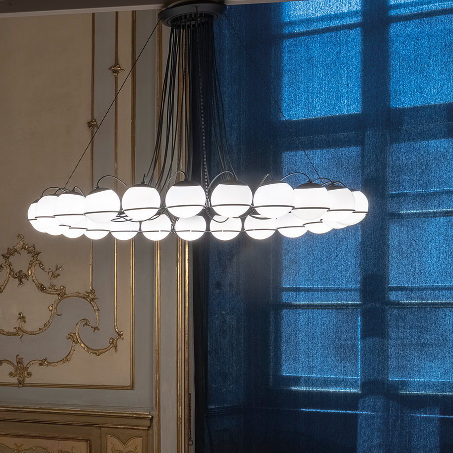 Ende der 1950er Jahre entwarf Gino Sarfatti für seine Firma Arteluce die Le Sfere Leuchtenserie, die bis heute Vorbildfunktion hat. Mittelpunkt waren dabei die runden Glaskugeln, die sichtbar an der Metallkonstruktion aufliegen. Zu dieser berühmten Leuchtenserie zählt der Kronleuchter 2109/24/14, die Zahlen 24 in der Produktnummer bezieht sich auf 24 opalen Glaskugeln mit je 14 cm Durchmesser.