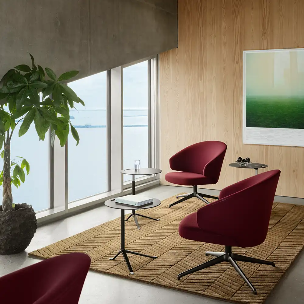 Der Let Lounge Chair mit Drehgestell ist eine Weiterentwicklung des ursprünglichen Designs von Sebastian Herkner in Kooperation mit Fritz Hansen. Die Kombination aus deutscher Designästhetik und dänischer Handwerkskunst zeigt sich in der hochwertigen Verarbeitung und der klaren, skulpturalen Form des Sessels. Die neue Variante mit Drehfunktion erweitert die Einsatzmöglichkeiten des Sessels erheblich. Sie bietet zusätzliche Beweglichkeit und eignet sich besonders für Umgebungen mit hoher Nutzungsfrequenz – etwa in Büros, Lounges oder öffentlichen Bereichen. Gleichzeitig bleibt der charakteristische Komfort des ursprünglichen Designs erhalten. Bemerkenswert ist die ungewöhnliche Sitzhöhe von 42 cm - der Loungesessel Let verbindet so einen Stuhl mit einem Sessel.