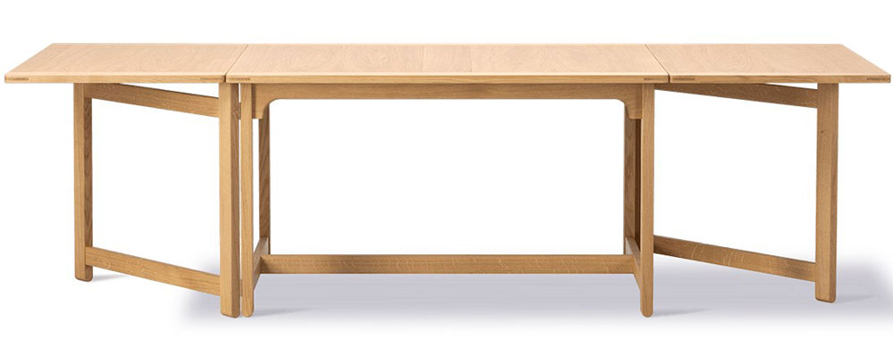 Der ausklappbare Bibliothekstisch von Børge Mogensen stammt aus dem Jahr 1958 und wurde von Fredericia 2020 neu aufgelegt. Der Tisch kann von 126 cm auf 189 cm, bzw. 252 cm, verlängert werden.