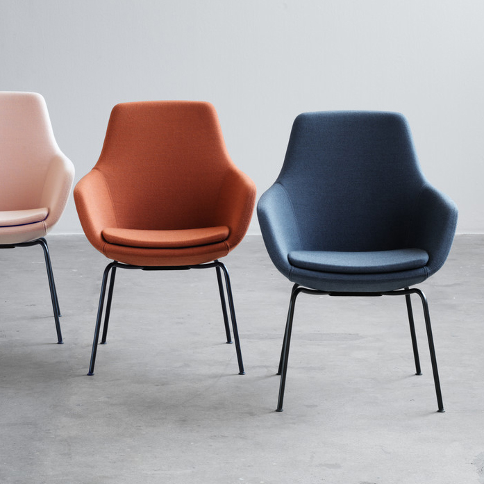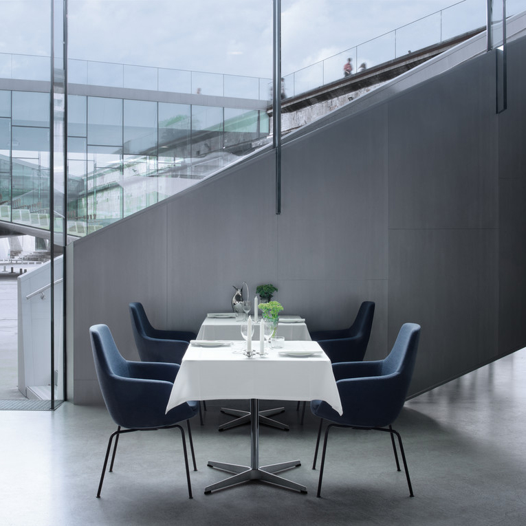 Für das Hotel Royal in Kopenhagen entwarf Arne Jacobsen 1959 unter anderem den hohen Sessel Giraffe. Dieser Sessel, der Namen leitete sich von der hohen Rückenlehne ab, verfügte ursprünglich über einen Holzrahmen, der die Schale und den Fuß umriss. 2018 entdeckte Fritz Hansen im Firmenarchiv eine kleinere Variante des Jacobsen Entwurfs, der damals nicht realisiert wurde. Diese Version mit dem niedriges Rückenteil entstand als Geschenk für den Hotelmanager des Hotel Royals. Seit 2019 wird nun der Sessel von Fritz Hansen erstmalig als Serie produziert – wahlweise mit dem sternförmigem Gestell auf Rollen oder wie hier mit einem vierbeinigen Fuß.