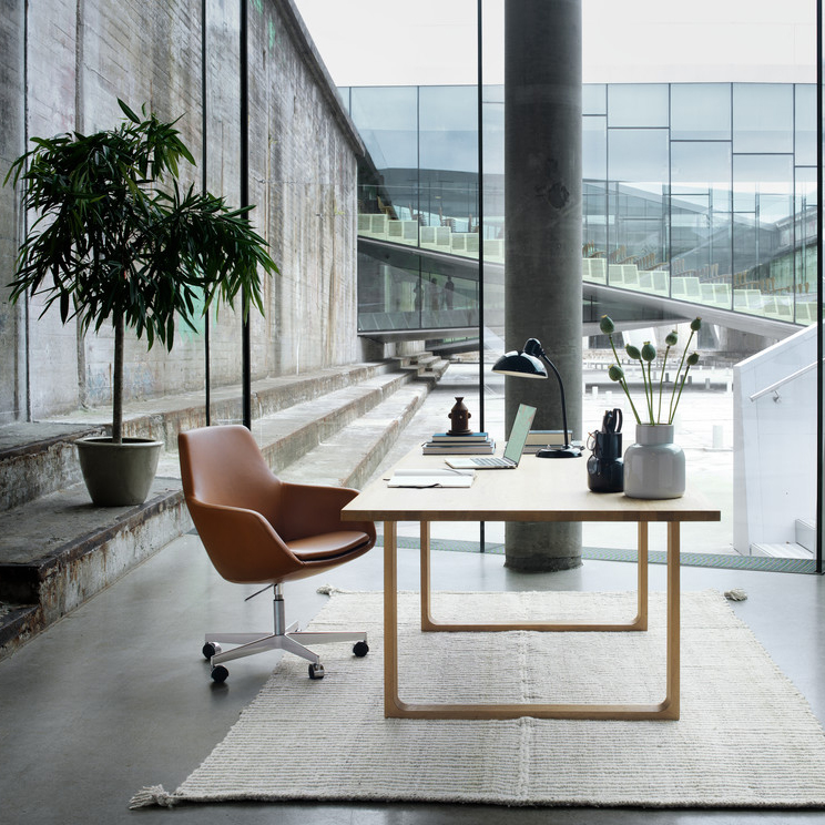 Den rollbaren und höhenverstellbaren Drehstuhl Little Giraffe entwarf Arne Jacobsen im Jahr als Geschenk für den Hotelmanager des Hotel Royals. Das Hotel Royal in Kopenhagen gilt als das Hauptwerk des dänischen Architekten. 2018 entdeckte Fritz Hansen im Firmenarchiv diese Variante des Jacobsen Entwurfs, der damals nicht realisiert wurde. Ab 2019 wird nun der Sessel von Fritz Hansen erstmalig als Serie nun produziert – wahlweise mit einem vierbeinigen Fuß oder - wie hier angeboten - mit dem sternförmigem Gestell auf Rollen.