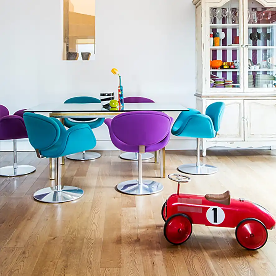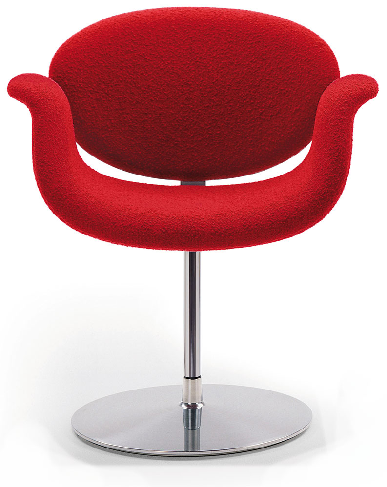 Der drehbare Little Tulip Chair ist ein Entwurf von Pierre Paulin aus dem Jahr 1965 und gehört zu einer ganzen Möbelserie, die er damals für Artifort entwickelte (zum Beispiel als Barstuhl oder Sessel, gerne auf Anfrage). Die Namensähnlichkeit zu Eero Saarinens Tulip Chair von Knoll war damals sicherlich gewollt. Allerdings ist dieser einbeinige Stuhl von der Formgebung ganz anders ausgelegt und ist für Artifort noch heute ein sehr erfolgreiches Produkt. Der Little Tulip Chair ist bei Markanto wahlweise mit den Bezugsstoffen Artifort Selecte oder Tonus erhältlich (andere Stoffe oder Leder gerne auf Anfrage). Zusätzlich ist der Stuhl noch mit dem sogenannten Cross-Base Fußgestell aus Edelstahl erhältlich.
