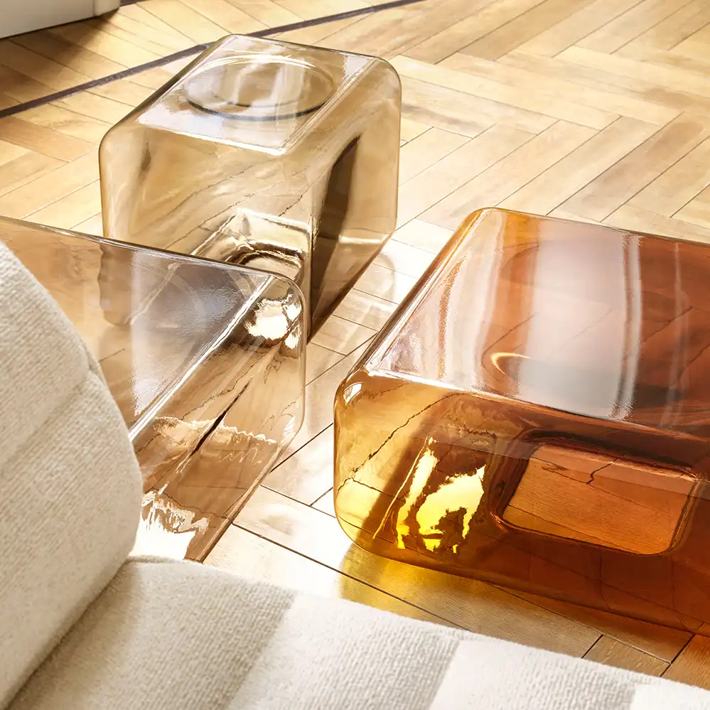 2024 entwarf Sabine Marcelis für Acerbis die drei rechteckigen Lokum Couchtische aus mundgeblasenem Glas, welches in einem Schmelztiegel in rauchgrau oder bernsteinfarben gefärbt wird. Die drei Glastische haben je unterschiedliche Maße und Höhen, gedacht ist es, mehrere Tische miteinander zu kombinieren.