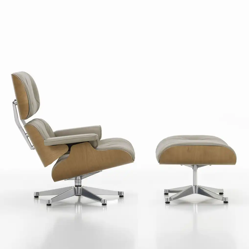 Seit September 2025 wird diese Variante des Eames Lounge Chair von Vitra aus europäischen Kirschbaum gefertigt, es bleibt dabei die preisgünstigste Version des Designklassikers. Das Leder ist passend zur Schale in vier ausgesuchten Farben möglich, das Aluminium-Gestell ist wahlweise poliert oder poliert mit schwarzen Seiten (1. Abbildung). Erhältlich ist der original Eames Lounge Chair von Vitra in zwei Größen – in der klassischen Originalversion aus den 1950er Jahren oder in einer zeitgemäßen XL-Version für größere Menschen.