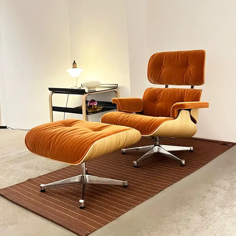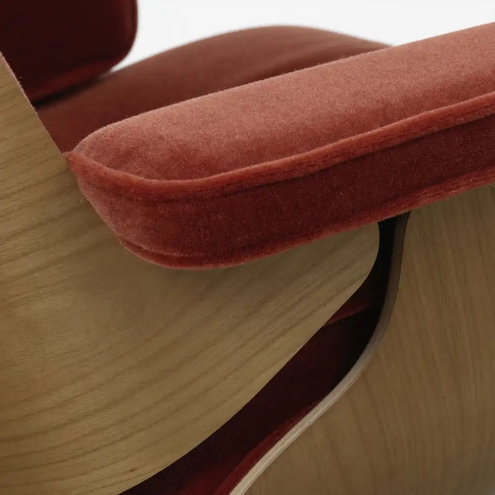 Der Eames Lounge Chair ist sicherlich der bekannteste Entwurf des Designer-Ehepaars und eine der wichtigsten Designikonen des 20. Jahrhunderts. Entworfen wurde die moderne Interpretation eines traditionellen Clubsessels bereits im Jahr 1956. Schon damals experimentierten die Eames mit unterschiedlichen Bezügen wie Leder und Stoff. Die mit Textilien bezogenen Lounge Chairs wurden aber bei Herman Miller nur innerhalb eines kurzen Zeitraums oder als Prototypen gefertigt. Die Konstruktion der Schale greift auf Elemente früherer Entwürfe von Charles und Ray Eames auf – wie bei den Möbeln der Plywood Group wurde für die Schale Schichtholz verwendet.