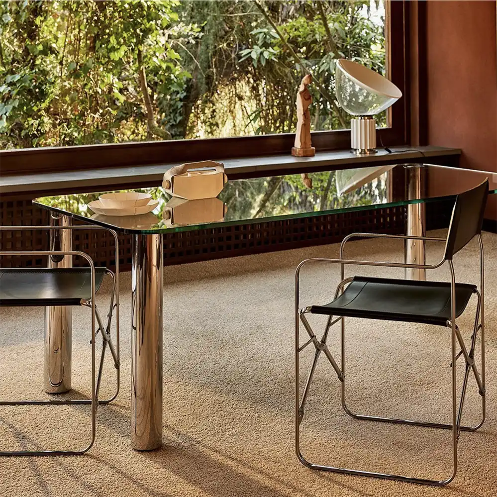 Ende der 1960er Jahre entwarf Marco Zanuso seinen Esstisch, der von Zanotta heute in drei Größen gefertigt wird. Die Tischplatte ist aus Kristallglas, die abnehmbaren Beine bestehen aus Inoxstahl mit 10 cm Durchmesser. Mit dieser Lösung brach Zanuso mit den traditionellen Strukturen für einen Tisch aus Beinen und Querstreben. „Zanuso führte die formale Konfiguration des Objekts auf die grundlegenden Geometrien von Kreis, Quadrat und Rechteck zurück” so der italienische Designkriktiker Stefano Casciani über den Entwurf. Seit 2025 ist der Tisch auch wieder in einer runden Version bei Zanotta erhätlich.