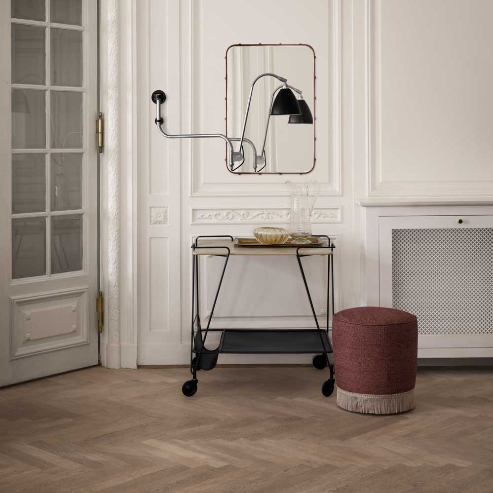 Den kleinen Barwagen oder Servierwagen entwarf Mathieu Matégot in den 1950er Jahren. Typisch für Matégot ist dort wieder der Einsatz von perforiertem Metall als Gestaltungsmittel. Seit 2021 ist der Barwagen nur noch komplett in schwarz bei Gubi erhältlich.