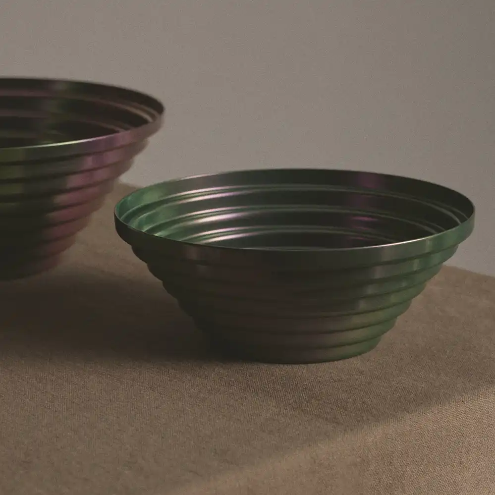 Die Korbschale Maya wurde in den frühen 1970er Jahren von dem italienischem Grafiker Giulio Confalonieri entworfen und 2025 von Alessi in zwei Versionen und Größen neu aufgelegt. Damals wandte sich eine Gruppe italienischer Grafikdesigner den Überschneidungen zwischen Grafikdesign und Industriedesign zu. Die von Silvio Coppola, Giulio Confalonieri, Franco Grignani, Bruno Munari und Pino Tovaglia für Alessi entworfene Kollektion von Körben und Tabletts wurde damals als sogenanntes „Exhibition Design“ bekannt – war eines der wichtigsten Ergebnisse dieser Forschungen. Unter den von Giulio Confalonieri vorgeschlagenen Entwürfen war der Maya-Korb eine wesentliche und zugleich geheimnisvoll reflektierende Linie. Ein grafisches Design, das sich in drei Dimensionen entwickelte und mittels Kaltumformung in Stahlblech übersetzt wurde, weist es die für die 1970er Jahre typischen scharfen Winkel auf, wobei die feinen Verbindungsdetails das Ganze veredeln und abmildern. Die heute aufgelegte Edition erfolgt in zwei schillernden Ausführungen aus epoxidharzbeschichtem Stahl in Grün- und Violett-Tönen oder in Edelstahl.