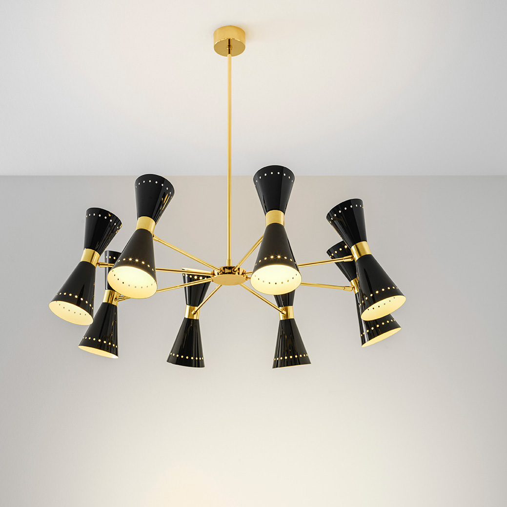 Mit acht Armen bzw. Reflektoren ist diese Version die größte Leuchte der Megafono-Kronleuchterserie. Die Ikone der 1950er Jahre von Stilnovo ist wahlweise mit drei, sechs oder acht Reflektoren erhältlich. Die sogenannten Konus-Reflektoren sorgen gleichzeitig für direktes und indirektes Licht. Der Werksentwurf ist wahlweise mit schwarzen oder elfenbeinfarbigen Reflektoren erhältlich, das Messinggestell ist mit 18 Karat vergoldet.