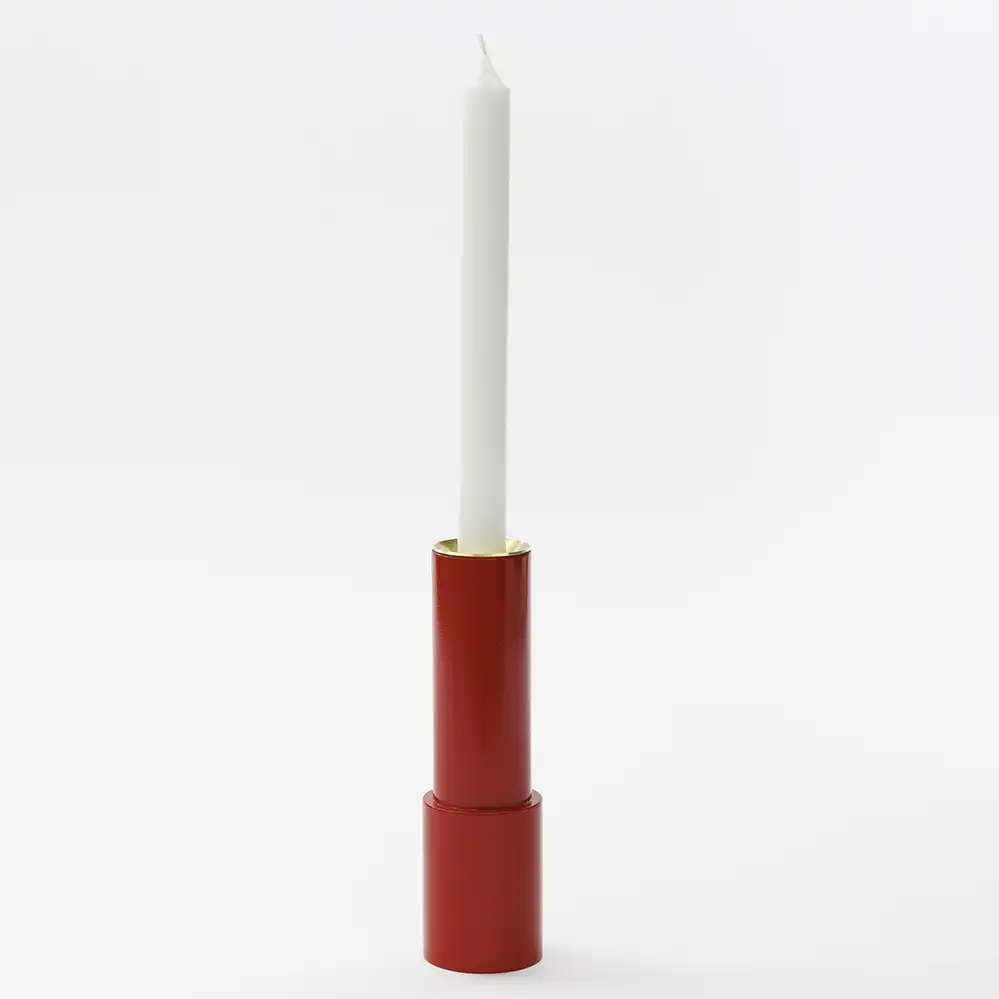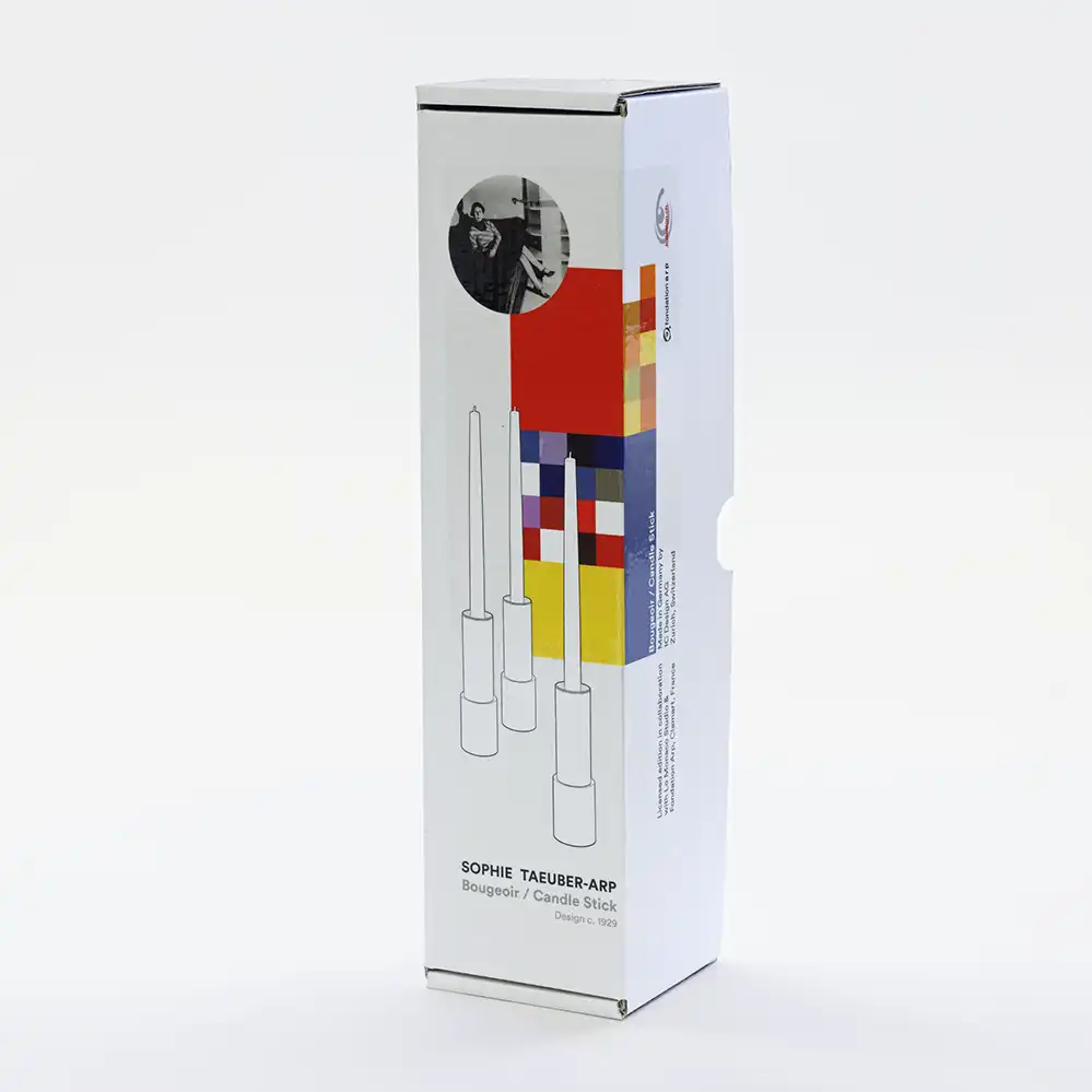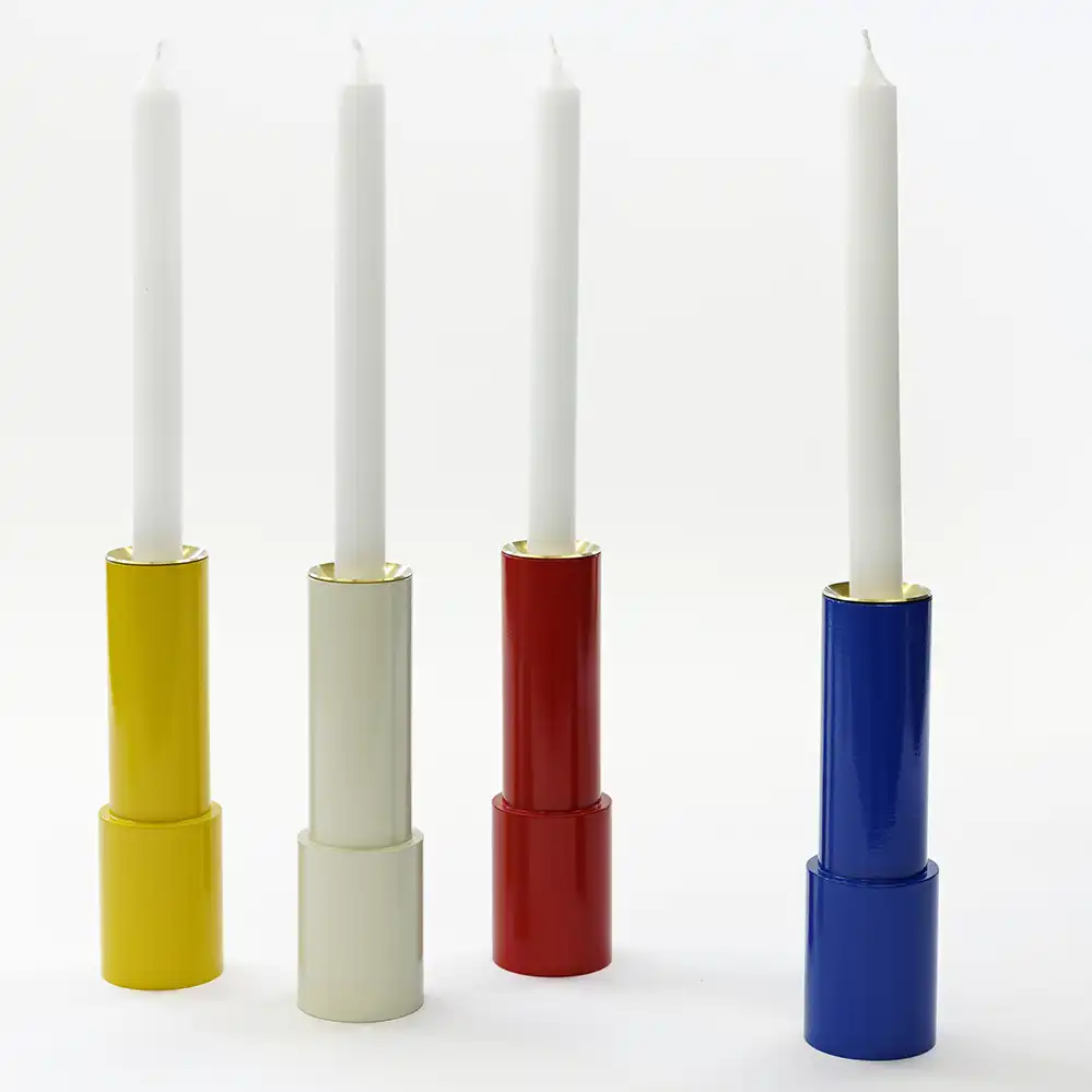 Im Jahr 1929 entwarf Sophie Taeuber-Arp diese vier Kerzenständer für ihr Haus in Meudon-Clamart, einem Vorort von Paris. DIe Kerzenständer haben eine einfache zylindrische und orthogonale Form und ergänzten auf harmonische Weise ihre selbst entworfenen Möbel in dem Haus. Die Reedition ist in den Primärfarben gehalten, gefertigt werden in Handarbeit sie im Schwarzwald (Messingeinsätze in der Schweiz). Lieferung ohne Kerzen, Preis pro Kerzenständer