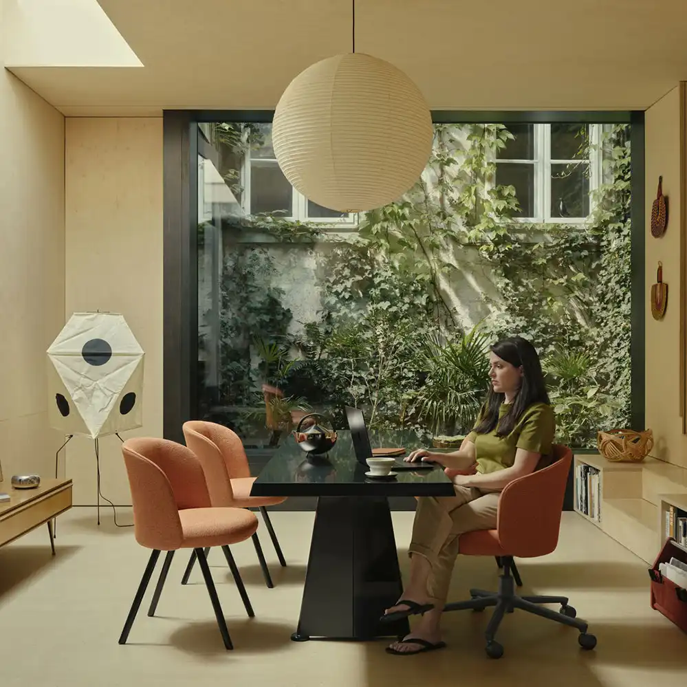 2024 entwarf das britische Duo Barber Osgerby für Vitra die Mikado Stuhlserie bestehend aus Arm Chair und Side Chair. Im Fokus stand dabei der außerordentliche Sitzkomfort verbunden mit einer Rundumpolsterung, ein durchdachter Mechanismus unter der Sitzfläche ermöglicht eine Bewegung der Rückenlehne. Zusätzlich besteht der sehr nachhaltige Stuhl zu einem großen Teil aus recycelten Materialien, auch können viele Bestandteile keinfach gewartet oder später durch den Vitra Service ausgetauscht werden.Und wenn Mikado doch mal ans Produktlebensende kommt, lassen sich seine Bestandteile zum Recycling oder zur Entsorgung trennen. Erhältlich sind die Stühle in zahlreichen Vitra Stoffen und Leder, wovon Markanto eine kuratierte Auswahl anbietet. Das Gestell ist wahlweise aus Eiche oder Aluminium.