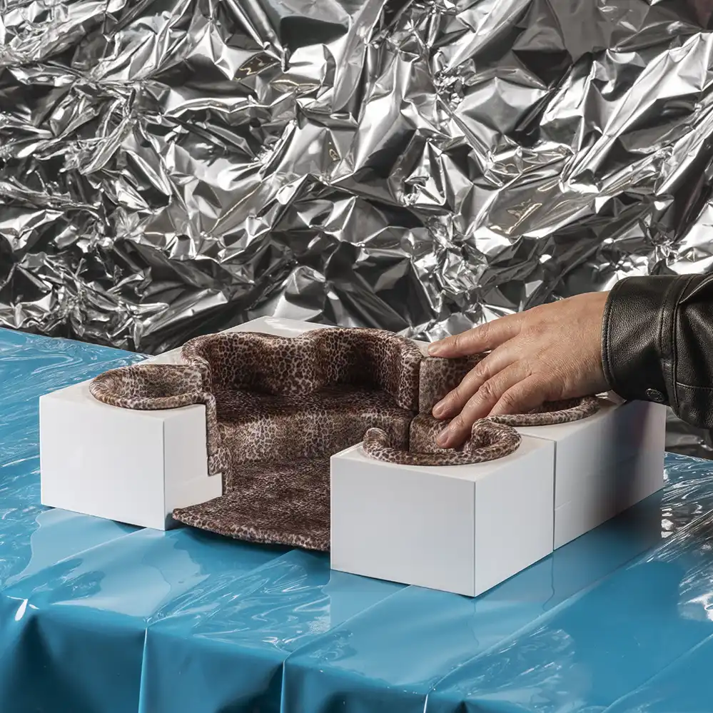 2025 legte Poltronova einige der größten Klassiker als Miniatur auf - darunter auch das revolutionäre Safari Sofa. Die überdimensionale Sitzlandschaft ist ein Mehrsitzer, bei dem die Rückenlehnen wie eine Reihe von Wellen geformt sind. Die Sitzlandschaft besteht aus vier verschiedenen Elementen zweier unterschiedener Sitztypen (zwei Sesselmodule und zwei Sofamodule) und wurde erstmalig 1968 von Poltronova produziert. Für die Struktur wurde die damals experimentelle Glasfasertechnik verwendet. Für die Sitz- und Rückenlehnenpolsterung wählte Archizoom einen Stoff mit einem Leopardenmuster. Das gleiche Muster wird für den zwischen den Sitzen platzierten Polyurethanschaumteppich verwendet. Die Wahl des Leopardenmusters war eine Referenz an das Werk Bedroom Ensemble (1963) von Claes Oldenburg, dem Meister der englischen Pop Art.