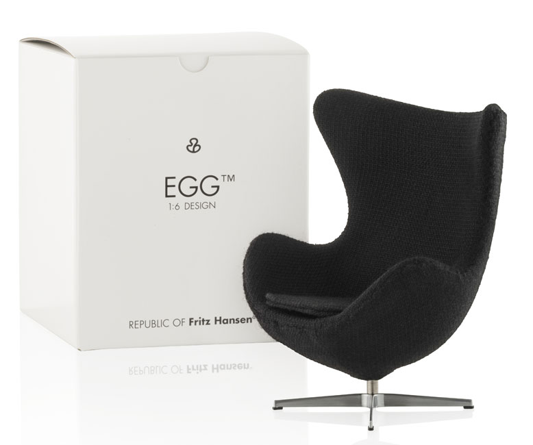 Seit 2016 bietet Fritz Hansen den dänischen Designklassiker Egg Chair als kleine Miniatur im Maßstab 1 zu 6 an. Der organisch geformte Sessel Ei (oder Egg Chair) von Arne Jacobsen entstand ursprünglich für die Inneneinrichtung des Hotel Royals in Kopenhagen. Das von 1956 - 1961 im Auftrag der Fluggesellschaft SAS geplante Hotel zählt zu Jacobsens Hauptwerk. Berühmt wurden dabei vor allem seine Entwürfe für die beiden Sessel Schwan und Ei.