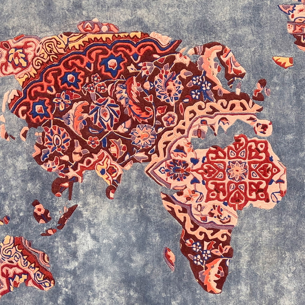 Als wir den Mondo Teppich von Lorenzo Damiani im Showroom von Cappellini als Wandteppich entdeckten, dachten wir, es wäre ein Kunstwerk. Denn so auffällig wirkt dieser Tepich, der die Weltkarte neu interpretiert, wobei die Kontinente durch Fragmente eines alten Perserteppichs gespiegelt und umrissen werden.
