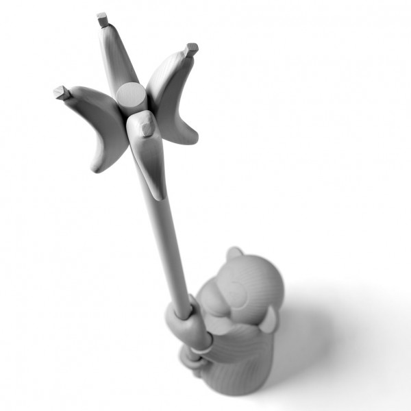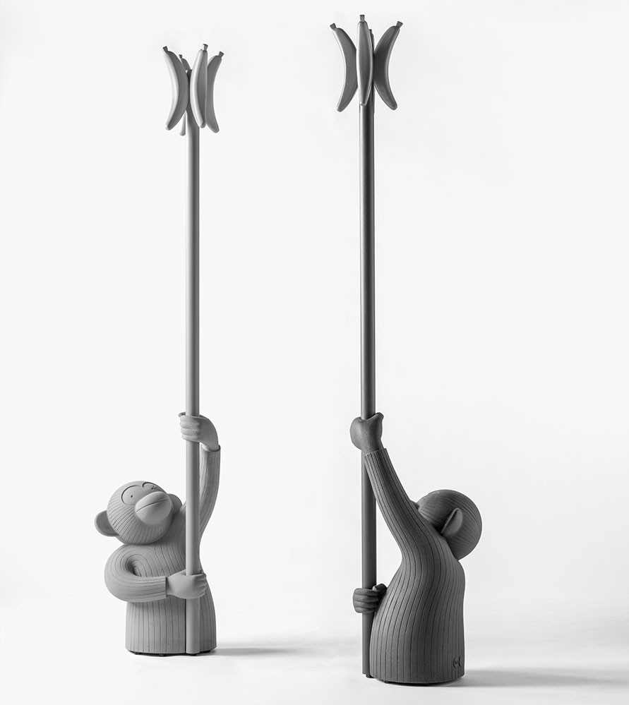 Basierend auf seinem skulpturalen Beistelltisch Monkey entwarf Jaime Hayon 2022 den Monkey Kleiderständer. Der Affe ist dabei wieder aus Architekturbeton, die Stange und Bananen in massiver Esche mit offenporiger Lackierung.