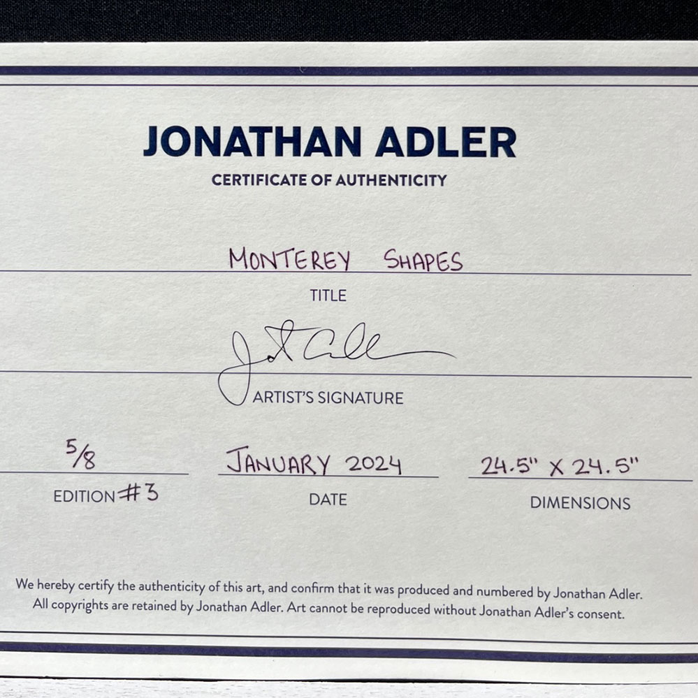 Seit einigen Jahren entwirft Jonathan Adler Wandbilder, zu denen seit 2024 das Motiv Monterey Shapes Cored Art aus konzentrische Kordeln zählt. Das grafische Motiv, das auch als Kissen-Design erhältlich ist, ist dabei von den 1960er Jahren inspiriert.