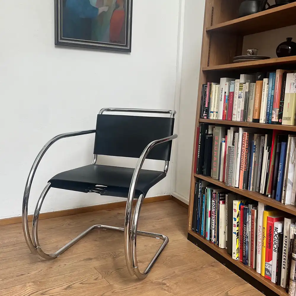 Der zweibeinige MR Stuhl von Knoll International gilt als einer der wichtigsten Stuhlentwürfe des 20. Jahrhunderts, denn es war der erste Entwurf eines Freischwingers. Der Entwurf von Ludwig Mies van der Rohe stammt dabei aus dem Jahr 1927 und entstand im Rahmen der bedeutenden Werkbund-Ausstellung in der Stuttgarter Weißenhofsiedlung. Entwerfer und Architekten wie Le Corbusier, Mart Stam, Ferdinand Kramer, P.P.P. Oud oder Ludwig Mies van der Rohe präsentierten hier ihre Vorstellungen für Modernes Wohnen. In dem heute unter Denkmalschutz stehenden Ensemble wurde entsprechend auch die Inneneinrichtung durch die verschiedenen Künstler gestaltet. Am bedeutendsten waren dabei die Entwürfe von Mart Stam und Ludwig Mies van der Rohe für hinterbeinlose Stühle.