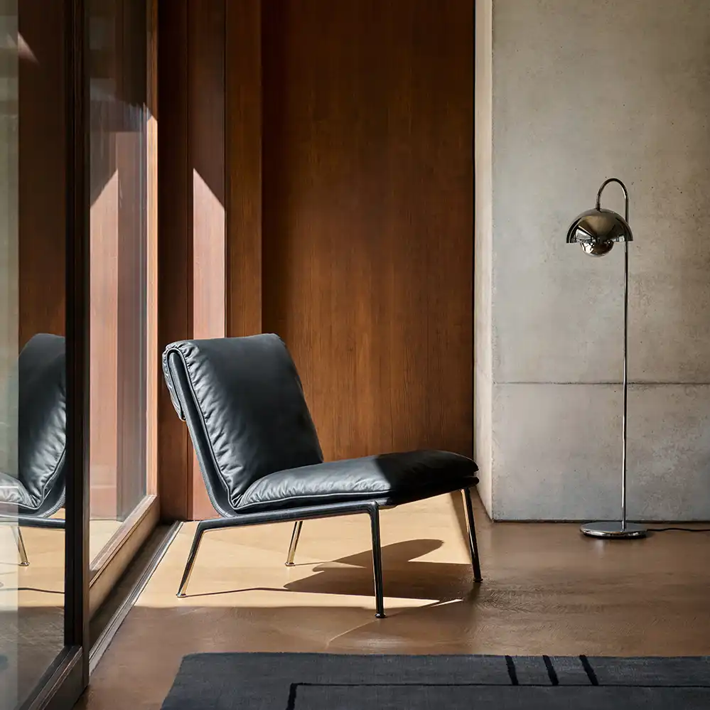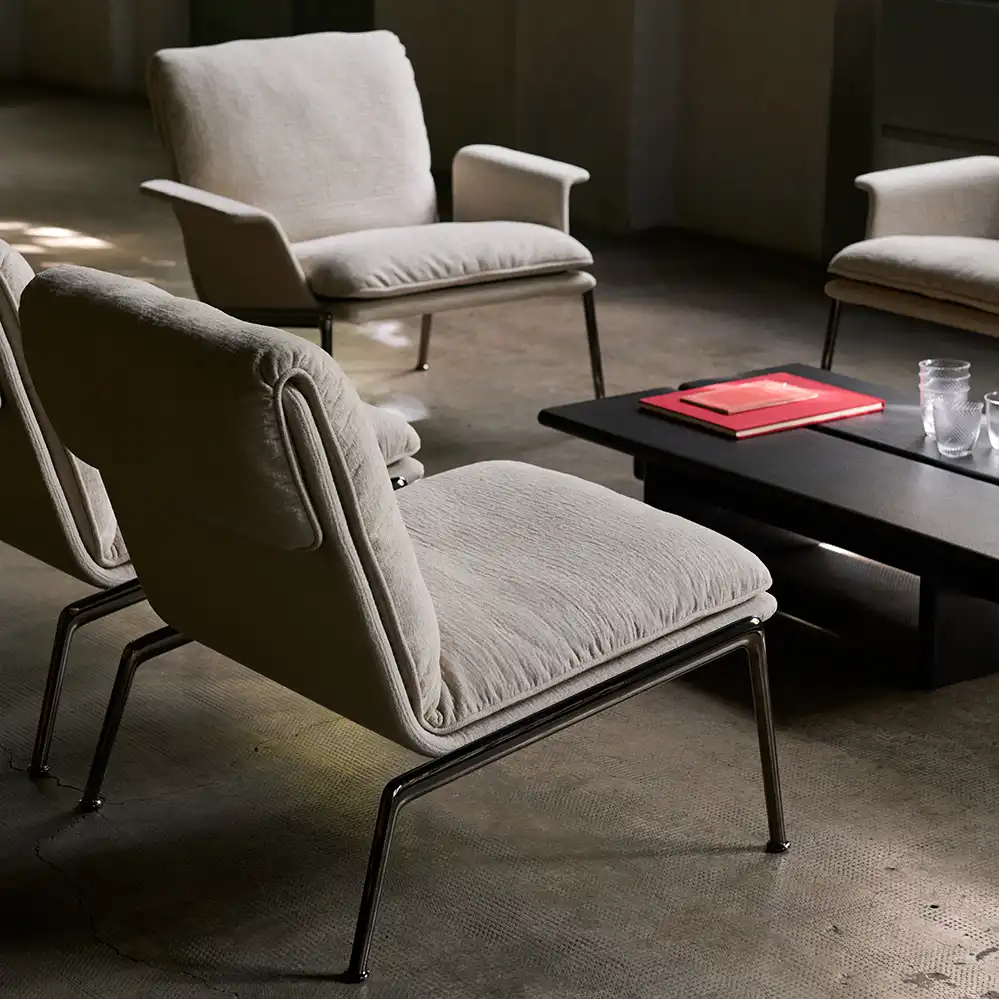 Die Muno-Serie, entworfen 2025 von Luca Nichetto für &tradition, umfasst vier Sesselvarianten, die sich durch unterschiedliche Rückenhöhen sowie die Wahl zwischen Modellen mit oder ohne Armlehnen auszeichnen. Nichetto vereint in diesem Design die klaren Linien skandinavischer Gestaltung mit der eleganten Formsprache italienischer Designtraditionen. Der Muno LN18 Sessel mit niedriger Rückenlehne überzeugt durch seine kompakte, zurückhaltende Silhouette, die eine moderne Leichtigkeit ausstrahlt und sich harmonisch in unterschiedliche Raumkonzepte einfügt. Trotz der reduzierten Höhe bietet der Sessel dank seiner ergonomisch geformten Sitzfläche und der sanft geneigten Basis hohen Komfort. Der leicht abgeschrägte Sockel unterstützt eine gesunde Sitzhaltung und unterstreicht die durchdachte Balance zwischen Ästhetik und Funktionalität. Der Sessel ist in verschiedenen Ausführungen erhältlich: wahlweise mit einem dunkel polierten Chromgestell oder einem schwarz lackierten Rahmen sowie in zahlreichen Bezugsvarianten. Auf Wunsch sind weitere Stoffoptionen sowie ein passender Ottoman verfügbar.