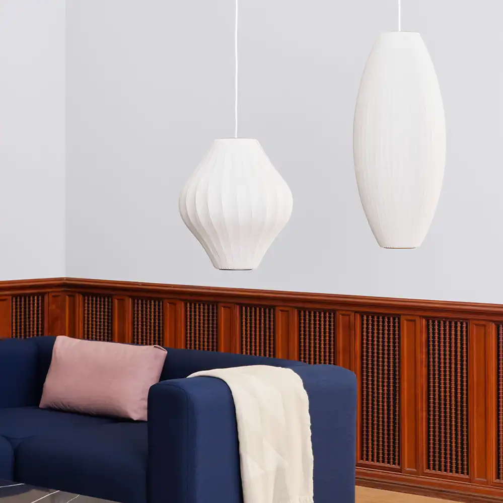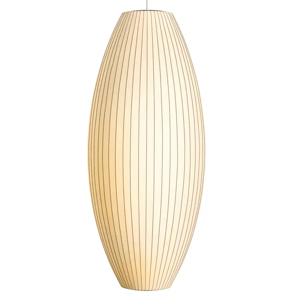 Die Nelson Cigar Bubble Lamp Large ist die größere Variante der zylindrischen Leuchtenform aus George Nelsons Bubble Lamp Kollektion. Mit ihrer schlanken Silhouette und dem vertikal verlaufenden Stahldrahtgestell setzt sie ein markantes Designstatement. Das aufgesprühte Webbing Polymer sorgt für ein gleichmäßiges, blendfreies Licht und verleiht der Oberfläche eine textile Anmutung. Produziert wird die Leuchte heute von HAY, nach dem originalen Verfahren und in Zusammenarbeit mit Herman Miller.