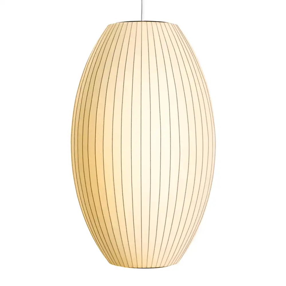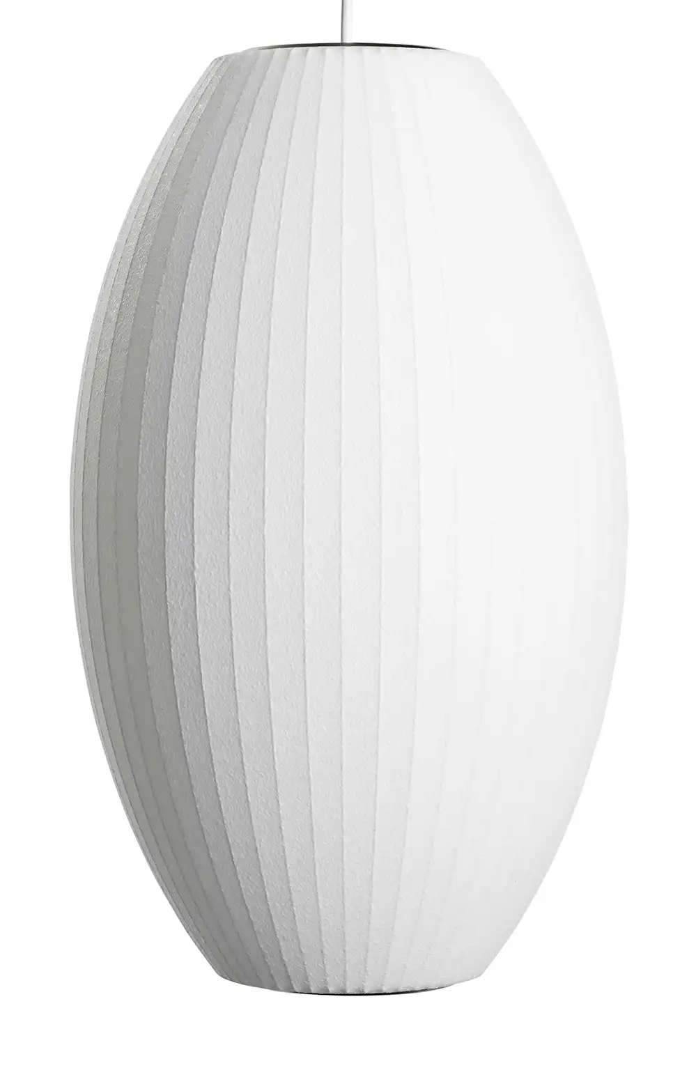 Die Nelson Cigar Bubble Lamp Medium ist ein klassischer Entwurf von George Nelson, der durch seine zylindrische Form und das vertikal verlaufende Stahldrahtgestell geprägt ist. Die Leuchte erzeugt durch das aufgesprühte Webbing Polymer ein gleichmäßiges, blendfreies Licht und fügt sich harmonisch in verschiedenste Raumkonzepte ein. Produziert wird die Leuchte heute von HAY, nach dem originalen Verfahren und in Zusammenarbeit mit Herman Miller.