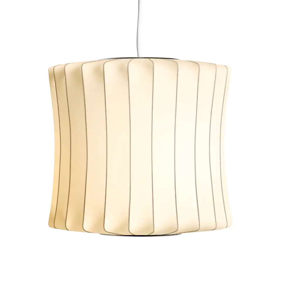 Die Nelson Lantern Bubble Lamp Small ist ein Entwurf von George Nelson mit einer vertikal ausgerichteten, leicht ausgestellten Silhouette, die an eine traditionelle Laterne erinnert. Das feine Stahldrahtgestell und die Polymerbeschichtung sorgen für eine klare Form und ein gleichmäßiges, blendfreies Licht. Produziert wird die Leuchte heute von HAY, nach dem originalen Verfahren und in Zusammenarbeit mit Herman Miller.