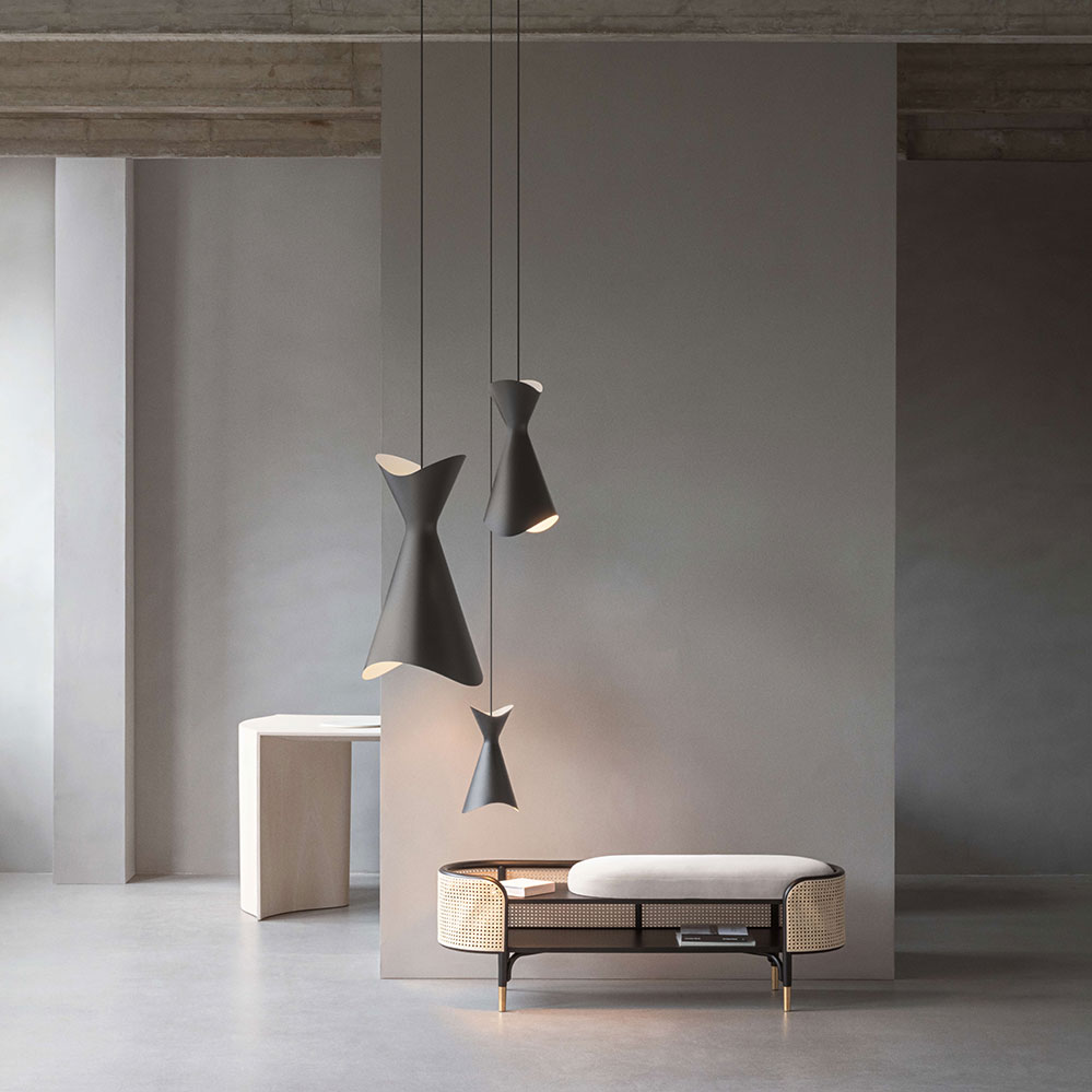 Die organisch geformte Pendelleuchte Ninotchka von Bent Karlby ist ein Entwurf aus dem Jahr 1954 und wurde von LYFA in vier Größen und drei Farben wieder aufgelegt. Abgeleitet ist der Produktname von dem Hut, den Greta Garbo in dem gleichnamigen Film Ninotchka aus dem Jahr 1939 trägt (siehe letzte Abbildung). Gedacht ist es verschiedene Leuchten unterschiedlicher Größe miteqainander zu kombinieren, aber selbstverständlich wirkt Ninotchka auch als Solitär.