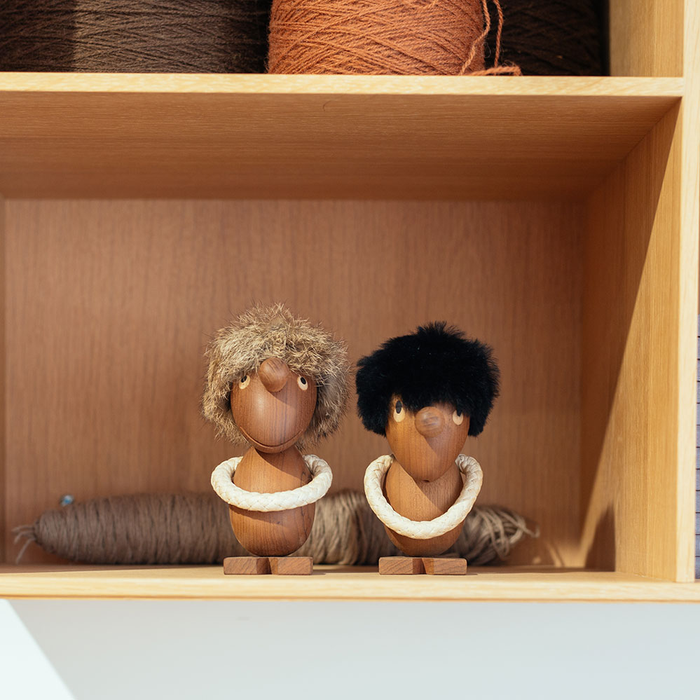 • Geöltes Teakholz, Arme aus Baumwolle, Kopfhaare aus Kaninchenfell, Augen aus Ahorn- und Ebenholz