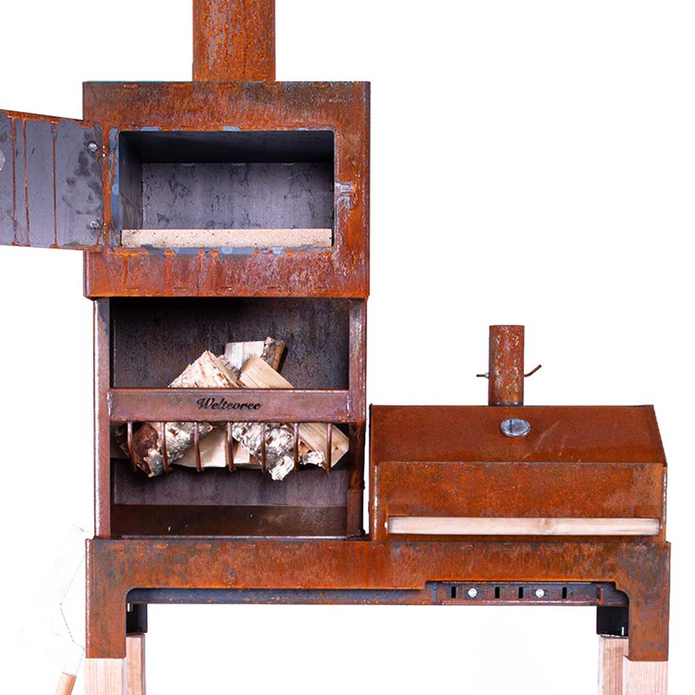 Der Outdoor-Ofen XL von Weltevree ist eine Weiterentwicklung des ersten Ofens von Dick van Hoff und verfügt über ein extra Holzgestell. Gefertigt wird der Ofen für den Außeneinsatz aus sogeanntem Cortenstahl, welcher auf der Oberfläche eine Sperrschicht aus Sulfaten oder Phosphaten bildet, welche den Ofen vor weiterer Korrosion schützt. Dabei ist der Ofen bei der Lieferung noch in der typischen Stahlfarbe, die aber durch den Outdoor-Einsatz schnell oxidiert.