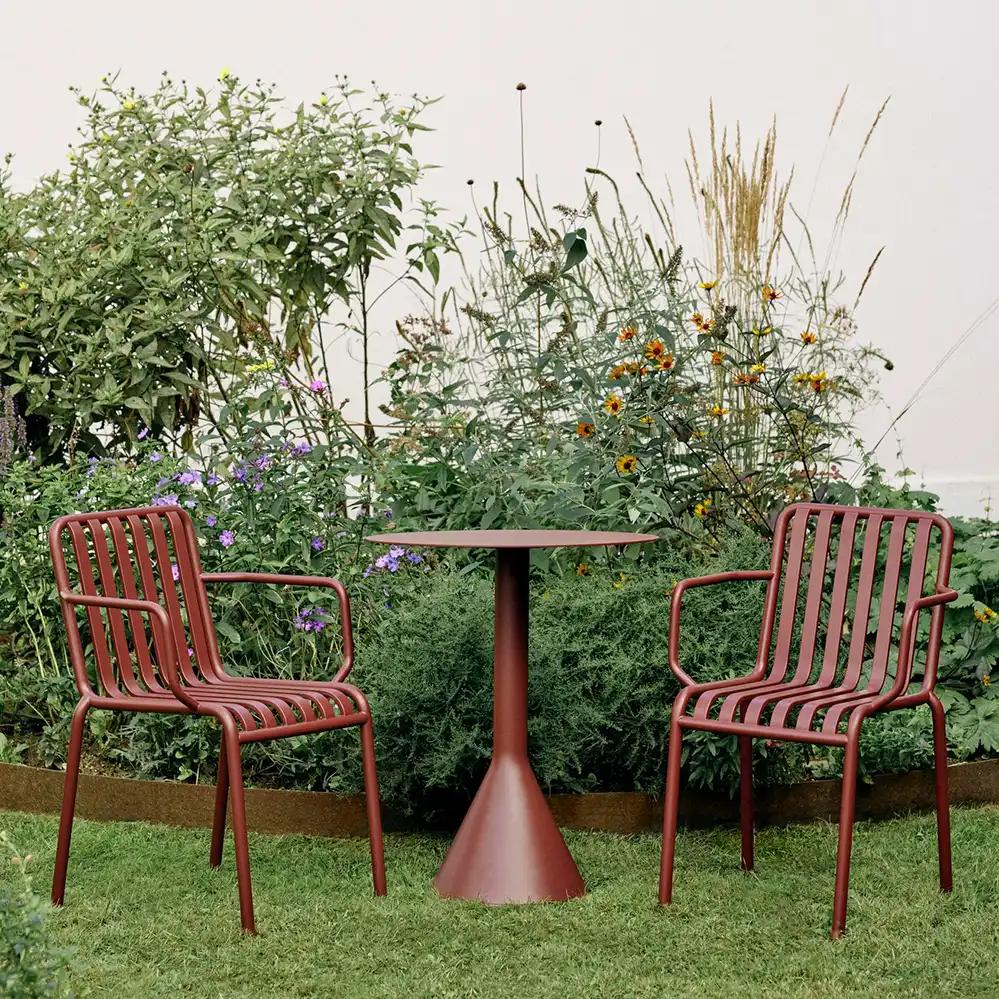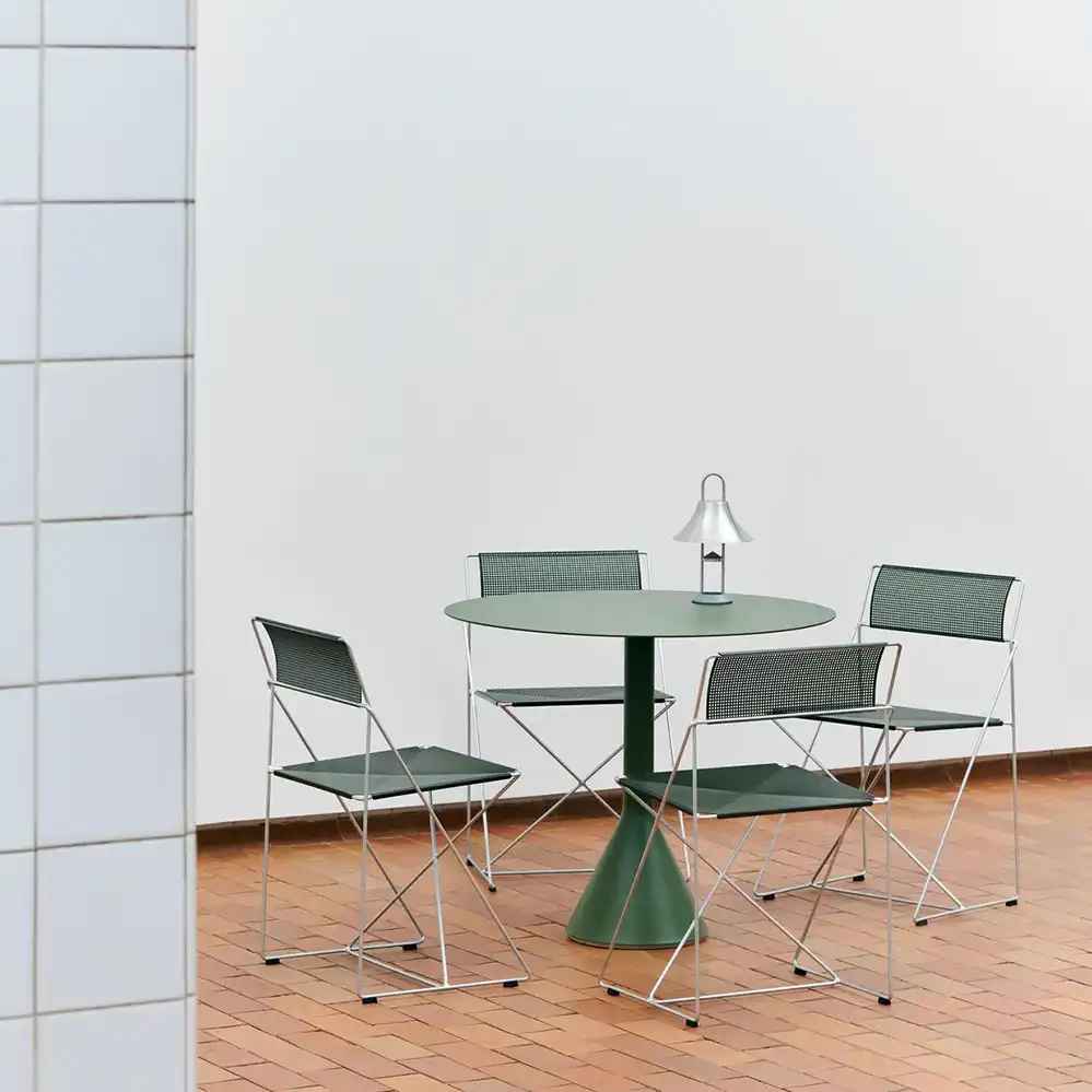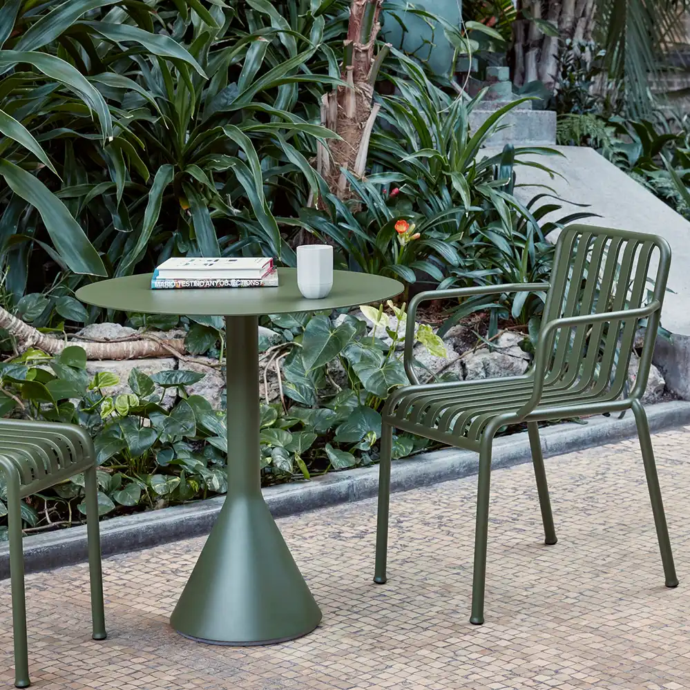Der runde Palissade Cone Table von Ronan und Erwan Bouroullec für HAY kombiniert skulpturale Präsenz mit funktionaler Klarheit. Der markante, konisch geformte Sockel verleiht dem Tisch nicht nur visuelle Stabilität, sondern sorgt auch für einen sicheren Stand – selbst bei windigem Wetter. Die runde Tischplatte aus pulverbeschichtetem Stahl ist in zwei Größen erhältlich: 70 cm für kompakte Außenbereiche wie Balkone oder kleine Terrassen, und 90 cm für großzügigere Settings mit mehr Platzbedarf. Dank der wetterfesten Materialien und der schützenden Grundierung ist der Tisch für den ganzjährigen Einsatz im Freien geeignet.