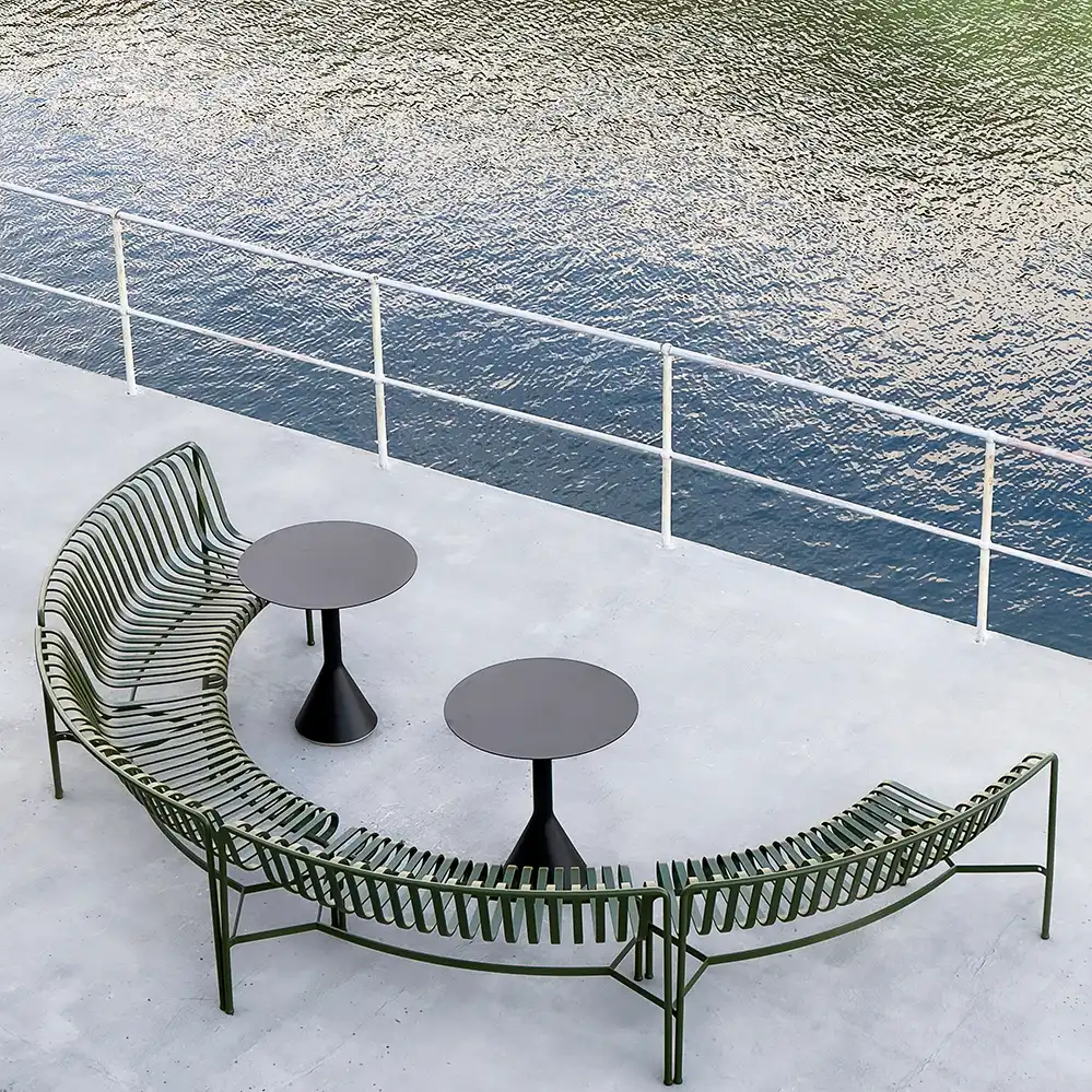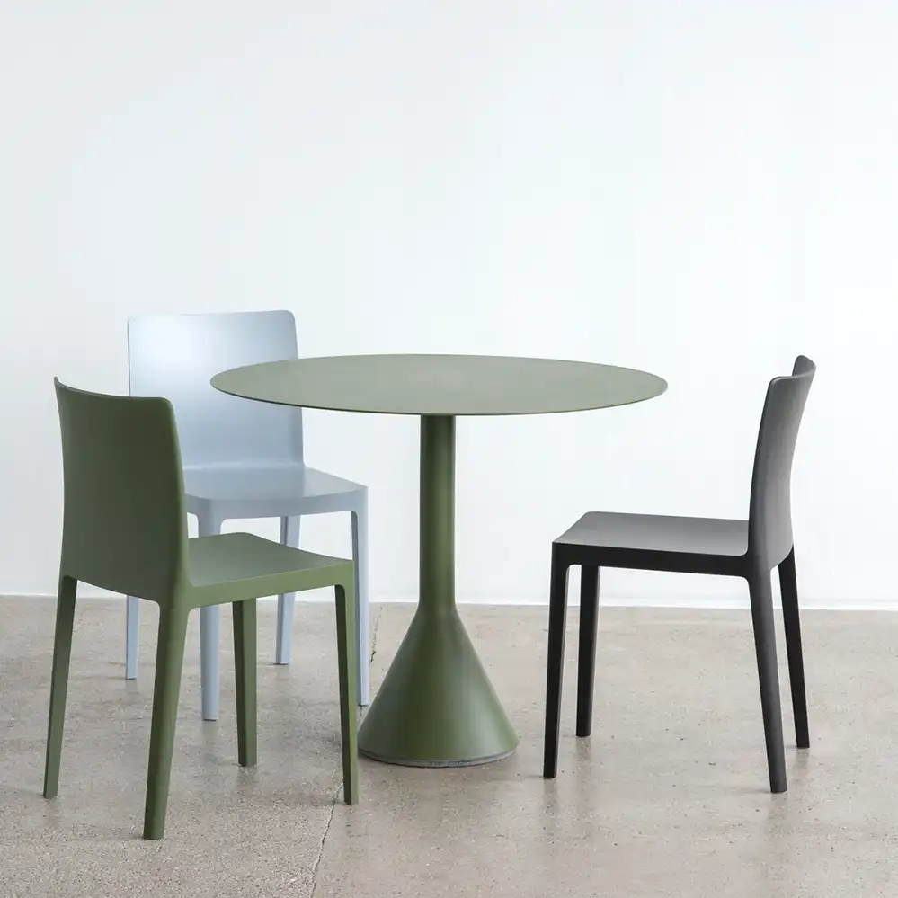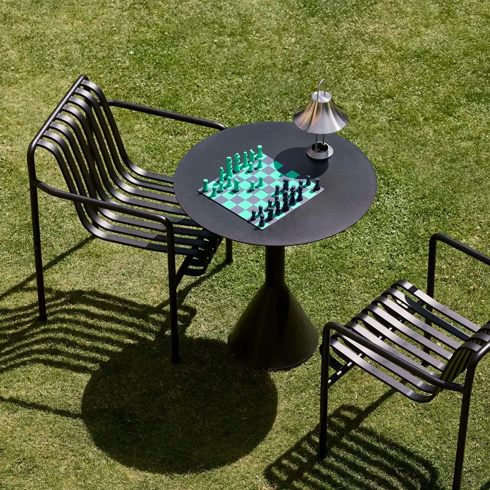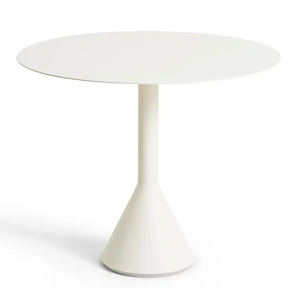 Der runde Palissade Cone Table von Ronan und Erwan Bouroullec für HAY kombiniert skulpturale Präsenz mit funktionaler Klarheit. Der markante, konisch geformte Sockel verleiht dem Tisch nicht nur visuelle Stabilität, sondern sorgt auch für einen sicheren Stand – selbst bei windigem Wetter. Die runde Tischplatte aus pulverbeschichtetem Stahl ist in zwei Größen erhältlich: 70 cm für kompakte Außenbereiche wie Balkone oder kleine Terrassen, und 90 cm für großzügigere Settings mit mehr Platzbedarf. Dank der wetterfesten Materialien und der schützenden Grundierung ist der Tisch für den ganzjährigen Einsatz im Freien geeignet.