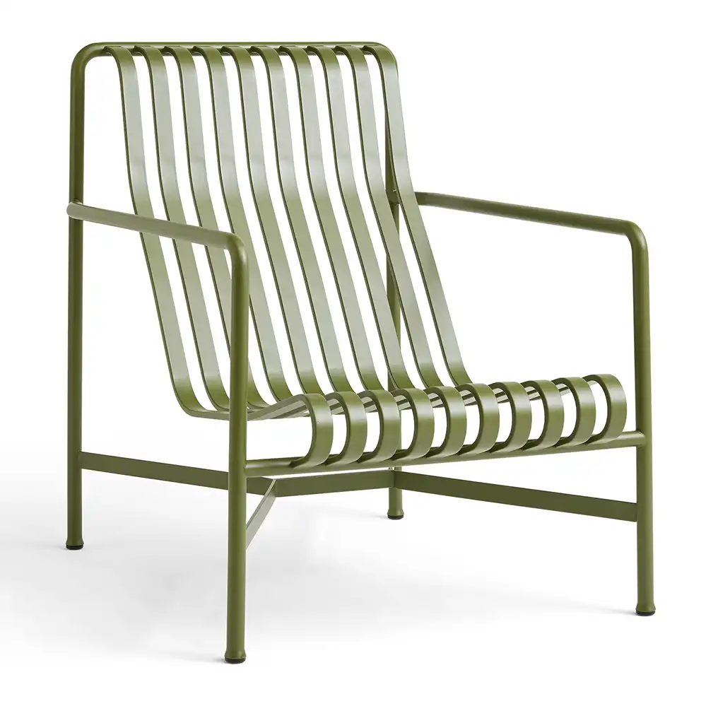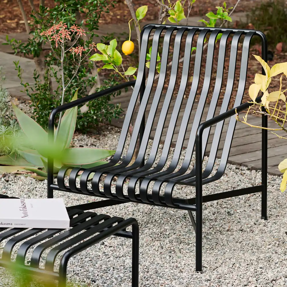 Der Palissade Lounge Chair High wurde von Ronan und Erwan Bouroullec für das dänische Designlabel HAY entworfen und bietet durch seine hohe Rückenlehne eine besonders komfortable Sitzposition für den Außenbereich. Die klare Linienführung und die offene Strebenstruktur sind charakteristisch für die gesamte Palissade-Kollektion und verbinden visuelle Leichtigkeit mit funktionaler Stabilität. Gefertigt aus pulverbeschichtetem, ist der Stuhl wetterfest und langlebig. Die Konstruktion ermöglicht eine gute Luftzirkulation und verhindert Wasseransammlungen, wodurch sich der Lounge Chair High ideal für den ganzjährigen Einsatz auf Terrassen, Balkonen, in Gärten oder öffentlichen Außenbereichen eignet. Zusätzlich lässt sich der Stuhl durch den optionalen Palissade Ottoman ergänzen.