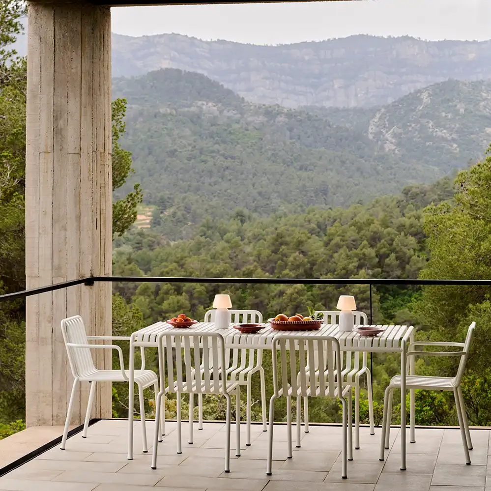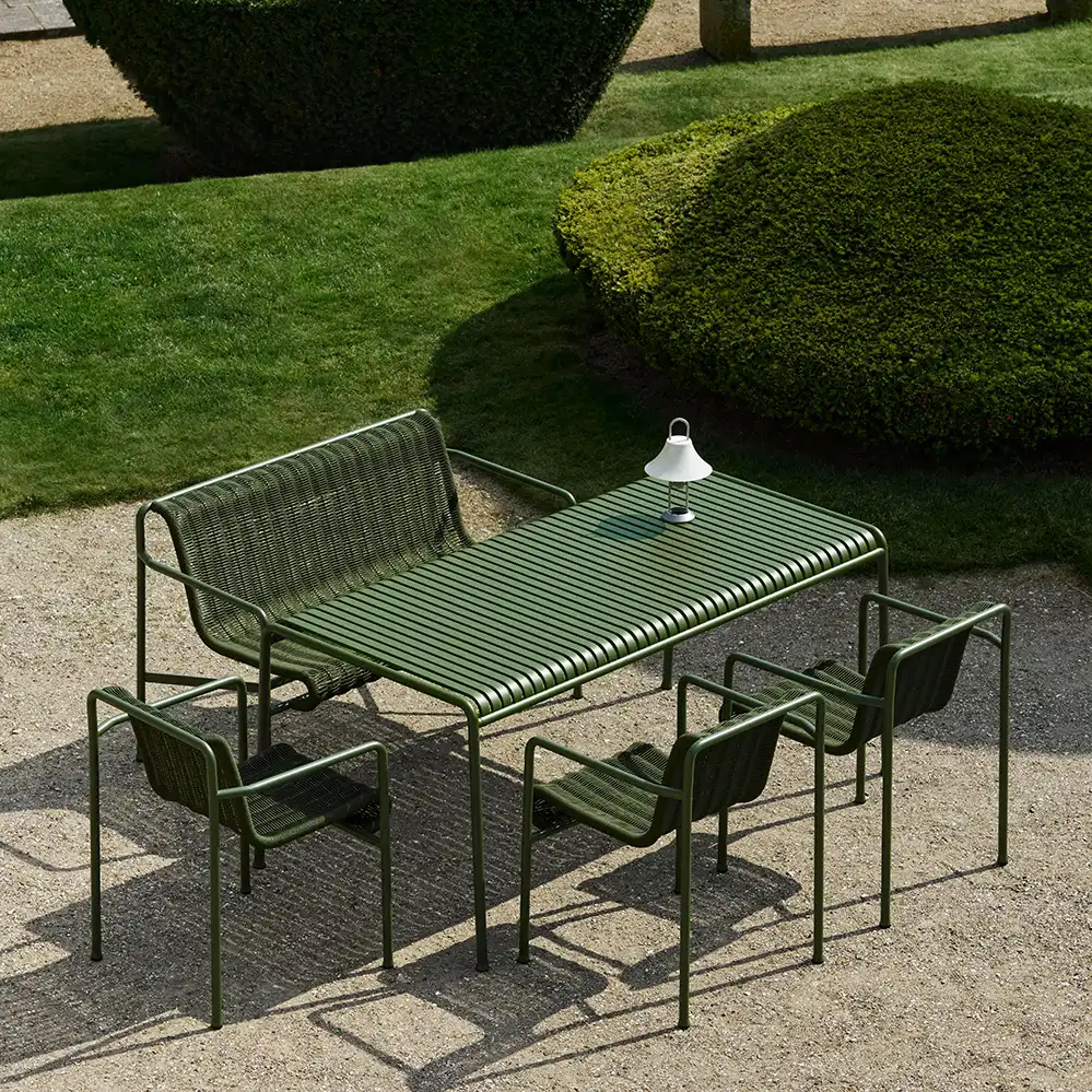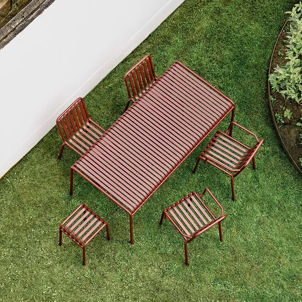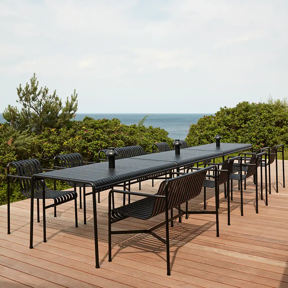 Der großzügige Palissade Table mit einer Länge von 170 cm wurde von den französischen Designern Ronan und Erwan Bouroullec für das dänische Label HAY entworfen. Als Teil der Palissade-Kollektion verbindet er eine klare, architektonische Linienführung mit hoher Funktionalität und Widerstandsfähigkeit – ideal für den Einsatz im Außenbereich. Die Tischplatte besteht aus längs verlaufenden Stahlstreben, die nicht nur für eine elegante Optik sorgen, sondern auch praktische Vorteile bieten: Regenwasser kann leicht abfließen, und die offene Struktur unterstützt die Luftzirkulation. Der Tisch ist aus pulverbeschichtetem oder galvanisiertem Stahl gefertigt und dadurch besonders wetterfest und langlebig.