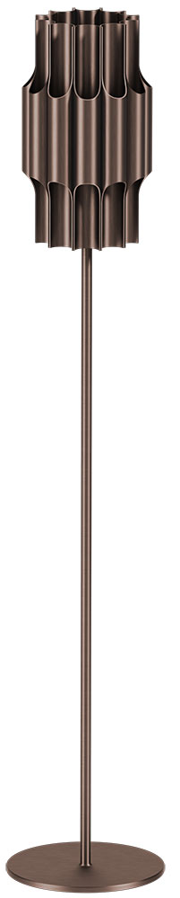 Die 130 cm hohe Pan Stehleuchte von Bent Karlby ist bei Lyfa wahlweise aus eloxiertem oder bronziertem Aluminium erhältlich Zusätzlich ist die Leuchtensereie noch als Wandlleuchte, Tischleuchte und als Pendelleuchte erhältlich.