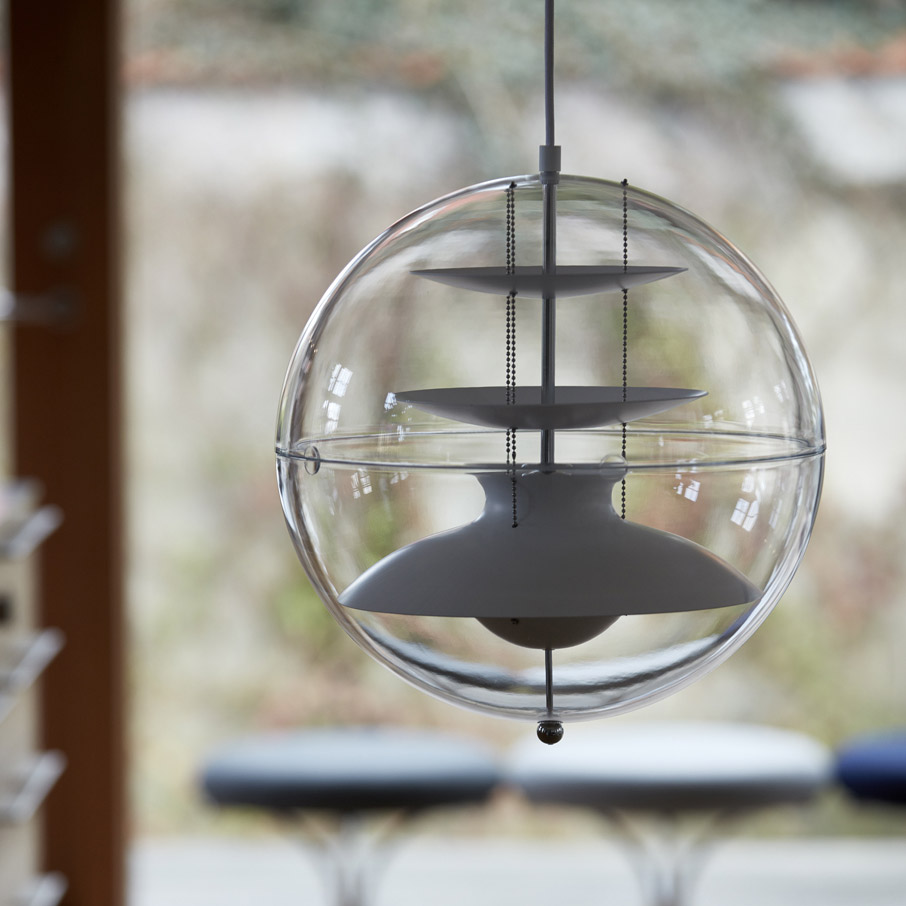 Die Pendelleuchte Panto von Verpan greift die Gestaltung der berühmten VP Globe von Verner Panton aus den 1960er Jahren auf. Ebenso wie diese Leuchte besteht Panto aus einer transparenten Acrylglaskugel. Die Panto ist ein Entwurf des dänischen Multitalents aus dem Jahr 1977 und wird heute von Verpan in den Durchmessern von 40 oder 50 cm produziert: