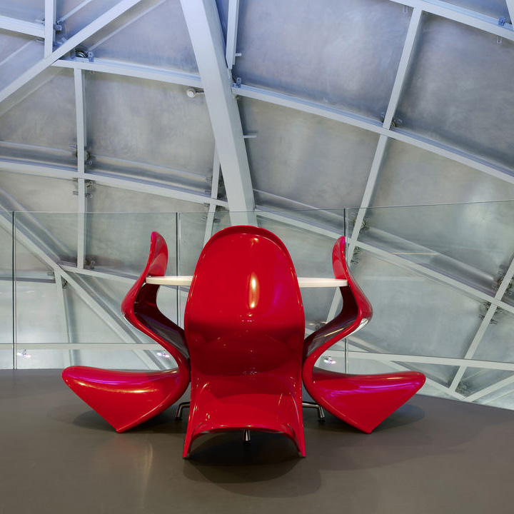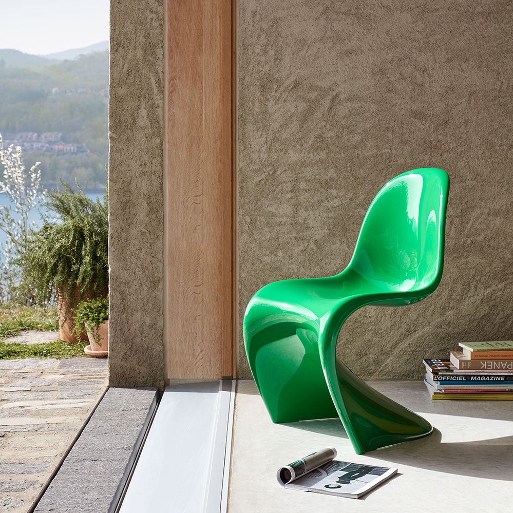 Der berühmte Panton Chair wird von Vitra heute in zwei Versionen gefertigt: als Panton Chair Classic mit einer hochwertigen Vollkunststoffschale aus hochglänzend, lackiertem Hartschaum und als Panton Chair aus preiswertem Polypropylen. In der glänzenden Anmutung wirkt der Designklassiker genauso wie die erste Serie aus den 1960er Jahren.