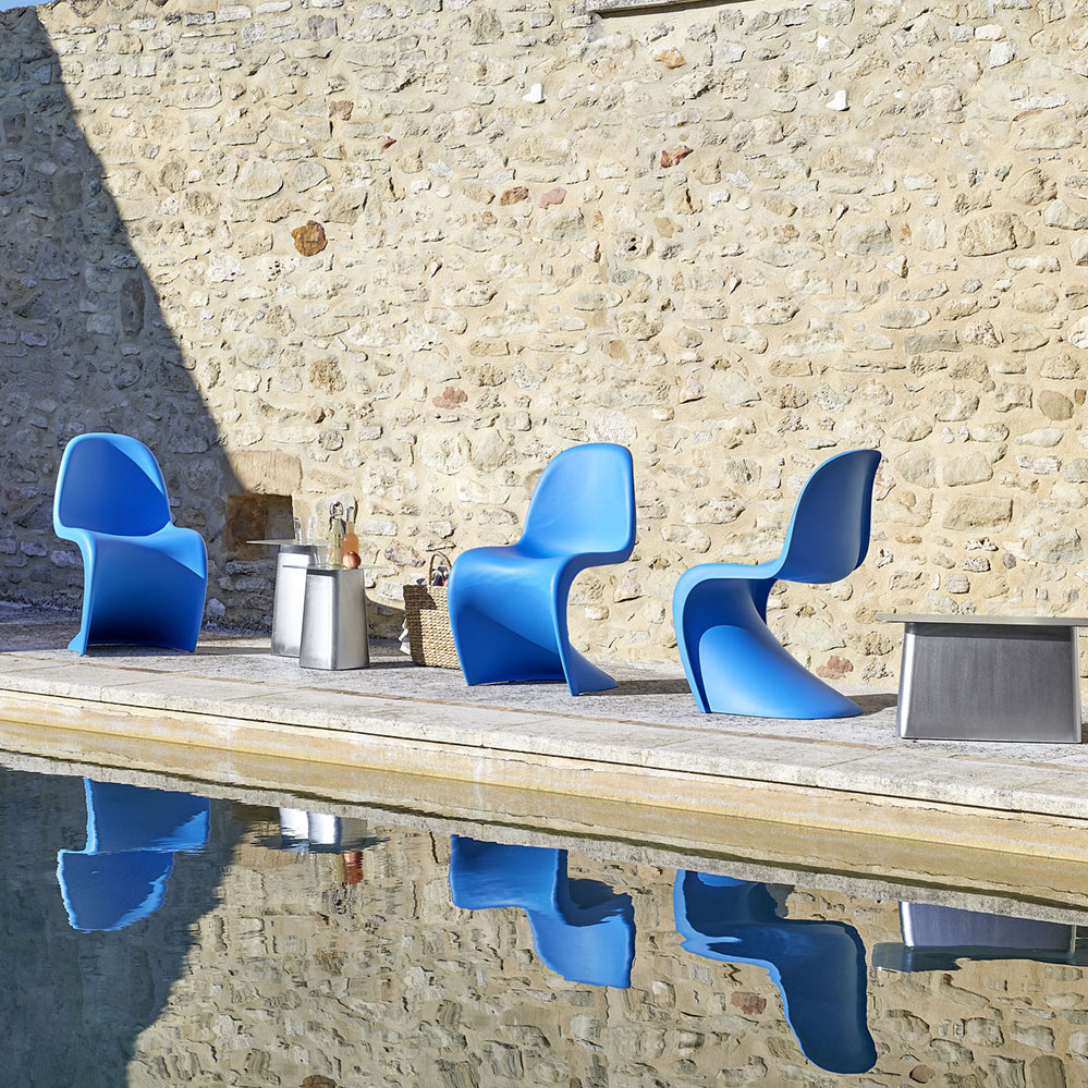 Der Panton Chair ist bei Vitra in zwei Ausführungen erhältlich: als Panton Chair aus matten Polypropylen (neue Version mit verbesserter Sitzgeometrie) oder als exklusiver Panton Chair Classic mit einer Vollkunststoffschale aus lackiertem Hartschaum. Die hier angebotene, stapelbare Variante ist die preiswertere Version des Designklassikers aus Polypropylen.