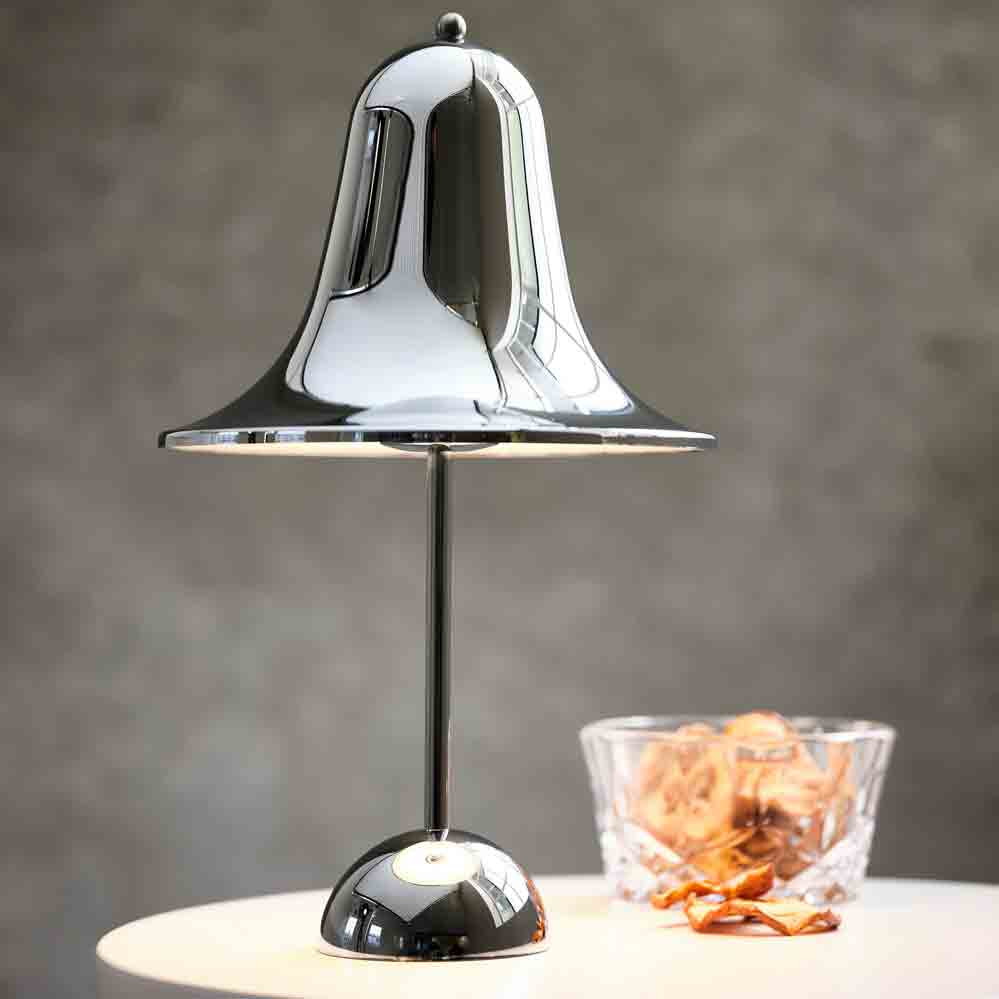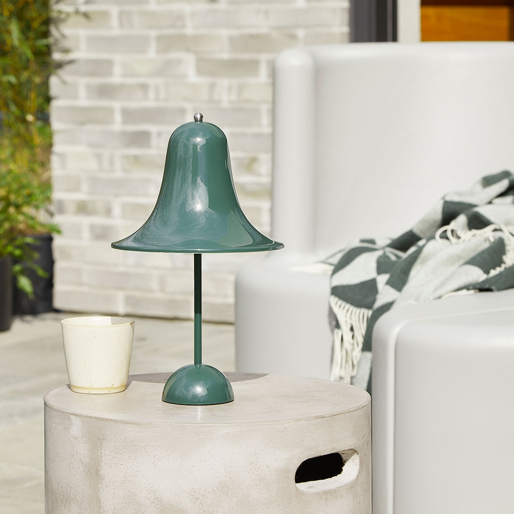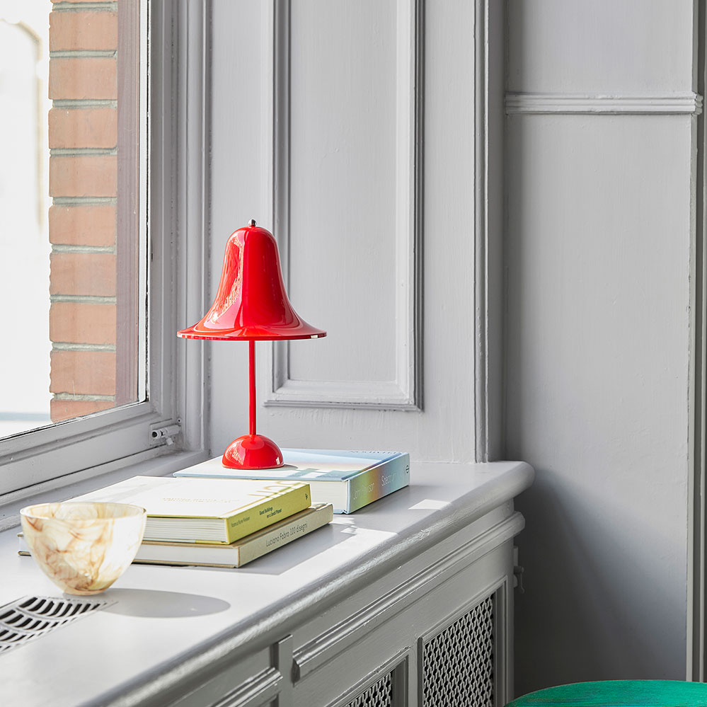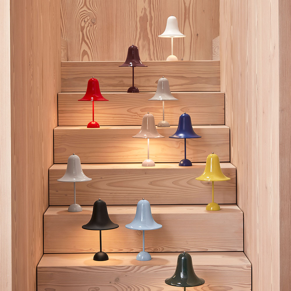 2021 legte Verpan die glockenförmige Pantop Tischleuchte von Verner Panton als kabellose, mobile Version aus. Die Leuchtenserie ist ein späterer Entwurf des dänischen Designers und besteht aus der Tischleuchte, Pendelleuchte sowie der Stehleuchte. Erhältlich ist die Pantop Portable Table bei Markanto nur einmal noch in den aufgeführten Versionen.
