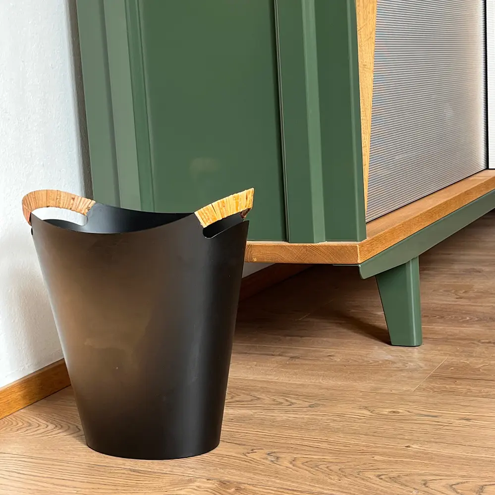1953 entwarf Grethe Kornerup Bang für das im gleichen Jahr gegründete Unternehmen Ørskov diesen wunderschönen Papierkorb aus schwarz emailliertem Eisen. Die Griffe werden dabei aus Rattan handgefertigt. Angeblich erfolgte der Entwurf zusammen mit Finn Juhl, wofür es aber nach unserer Recherche keine Belege gibt.