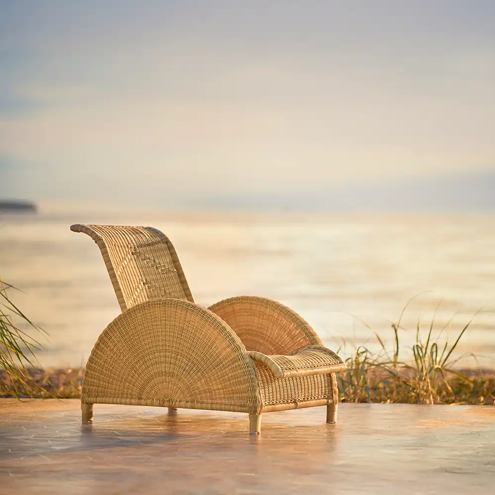 Neben der Indoor-Ausführung aus Rattan ist der Paris Chair von Arne Jacobsen auch aus Aluminium und Kunststoff für den Außeneinsatz erhältlich. Lieferbar ist der Klassiker wahlweise mit oder ohne der zweiteiligen Sitzauflage (bestehend aus Sitz- und Rückenkissen).