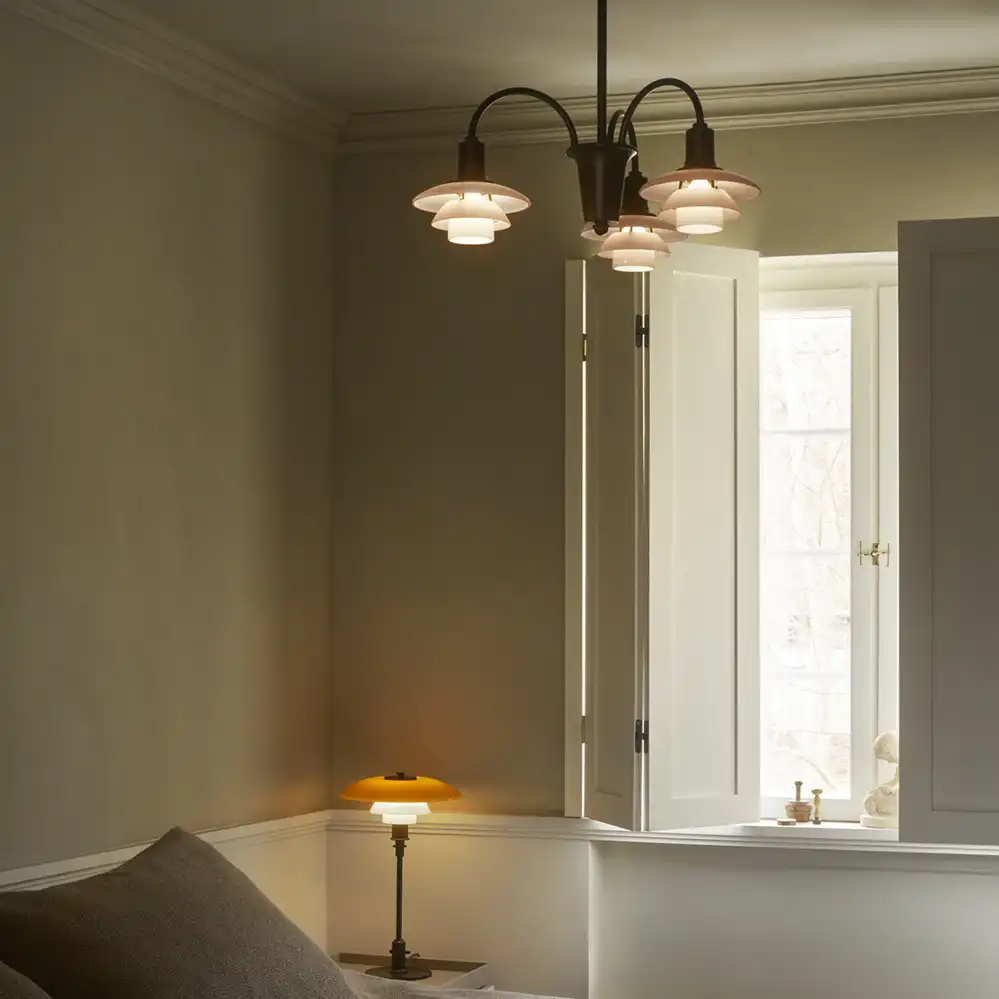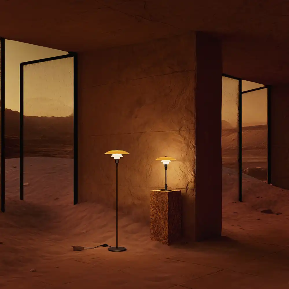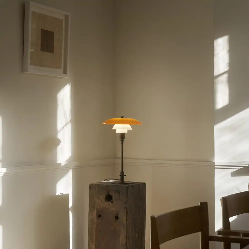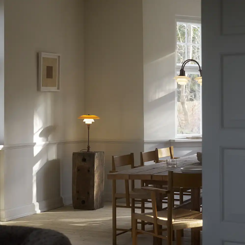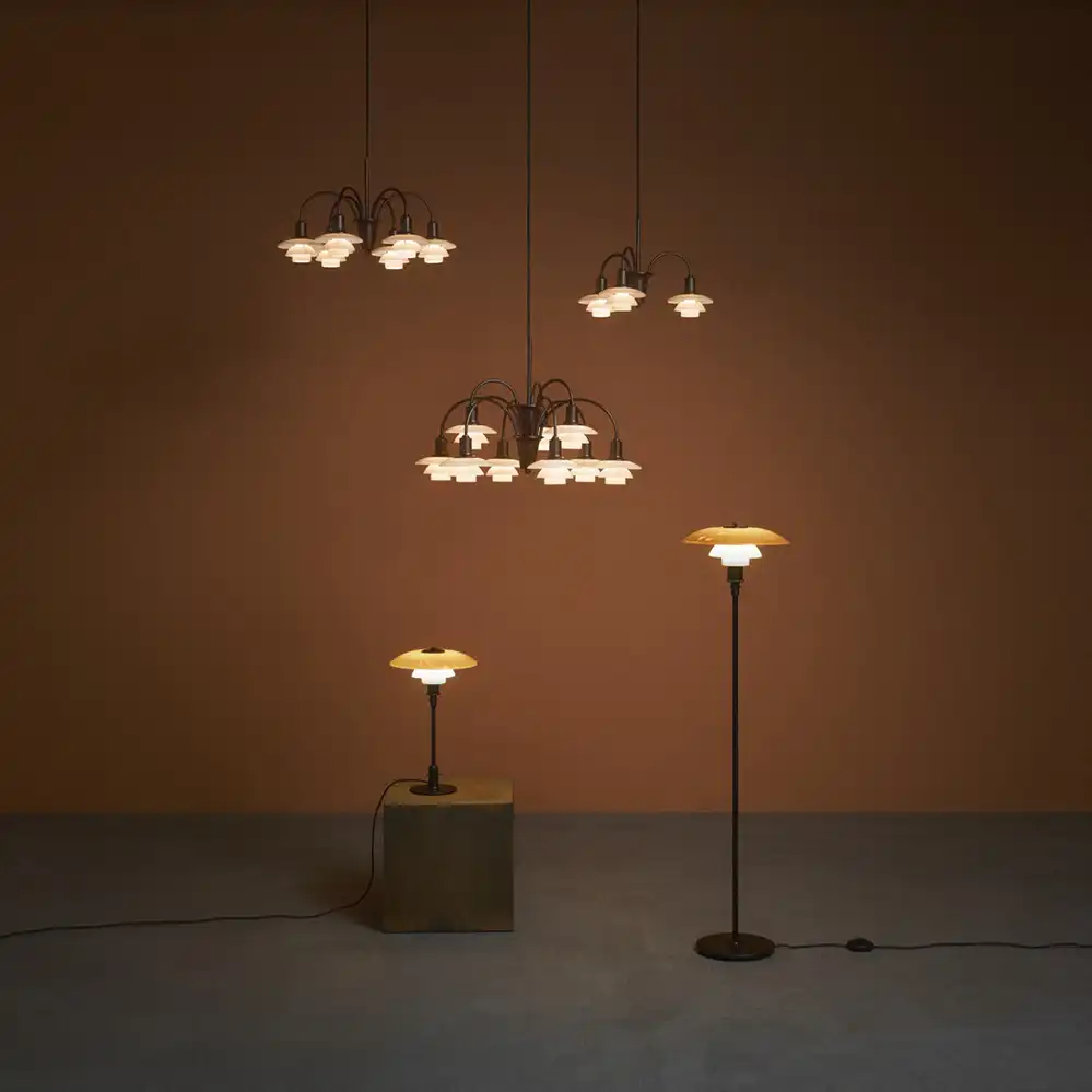 Anlässlich des 100‑jährigen Entwurfjubiläums des von Poul Henningsen 1926 entwickelten Dreischirmsystems erscheint die PH 3/2 Tischleuchte bei Louis Poulsen als Centenary Edition. Das durchdachte PH-System Pbasiert auf Schirmen, die nach einer natürlichen logarithmischen Kurve geformt sind und dadurch ein vollkommen blendfreies, in Ebenen abgestuftes Licht erzeugen, ein Grundprinzip, das seit 1926 die Identität der PH‑Leuchten prägt. Die Jubiläumsausgabe greift bewusst eine historische Gestaltungsvariante auf: den bernsteinfarbenen oberen Schirm in Kombination mit opalweißen unteren Schirmen. Diese Farb- und Materialkomposition entspricht den frühen klassischen Entwürfen Henningsens und findet sich auf zahlreichen originalen Vintage‑Modellen wieder. Der vierlagige, innen weiß ausgekleidete Bernsteinschirm erzeugt ein warmes, atmosphärisches Raumlicht, während die weißen Unterschirme ein klares, nach unten gerichtetes Licht liefern – genau so, wie es Henningsen im System PH ursprünglich vorgesehen hatte.