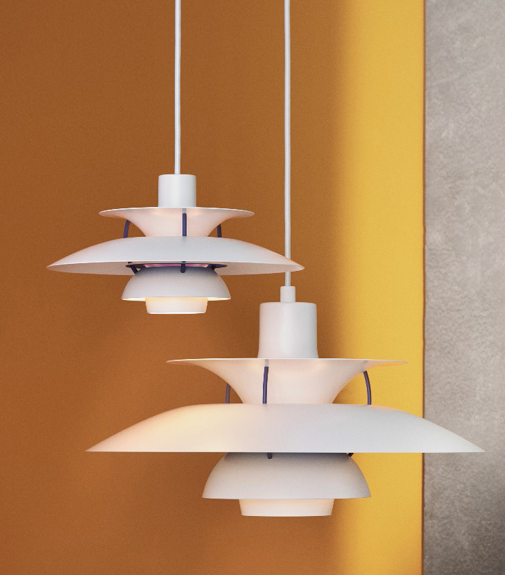 Die Pendelleuchte PH5 entstand im Jahr 1958 und ist der kommerziell erfolgreichste Entwurf von Poul Henningsen. Die klassische Ausführung der Aluminiumleuchte zeichnet sich durch das matt lackierte Aluminium und das typische blendfreie Licht aus. Seit 2017 ist der Lichtklassiker optional als kleinere Version mit 30 cm Durchmesser erhältlich (siehe 3. Abbildung).