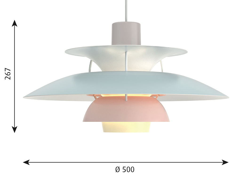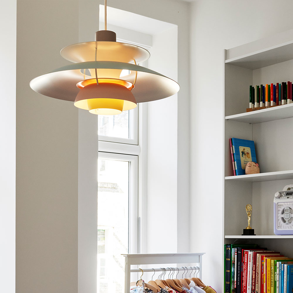 Die Pendelleuchte PH5 entstand im Jahr 1958 und ist der kommerziell erfolgreichste Entwurf von Poul Henningsen. Die klassische Ausführung der Aluminiumleuchte zeichnet sich durch das matt lackierte Aluminium und das typische blendfreie Licht aus. Poul Henningsen gilt als der wichtigste Leuchtenentwerfer Dänemarks, seine Kreationen fanden sich schon in den 1930er Jahren in zahlreichen Bauhaus-Modellhäusern. Seine Entwürfe basierten auf genauesten Berechnungen des Lichtfalls und zeichneten sich oft durch die durchdachte indirekte Lichtwirkung aus. Die erste PH-Leuchte (PH steht für seine Initialen) entstand bereits 1926 und wurde damals wie heute von Louis Poulsen hergestellt.