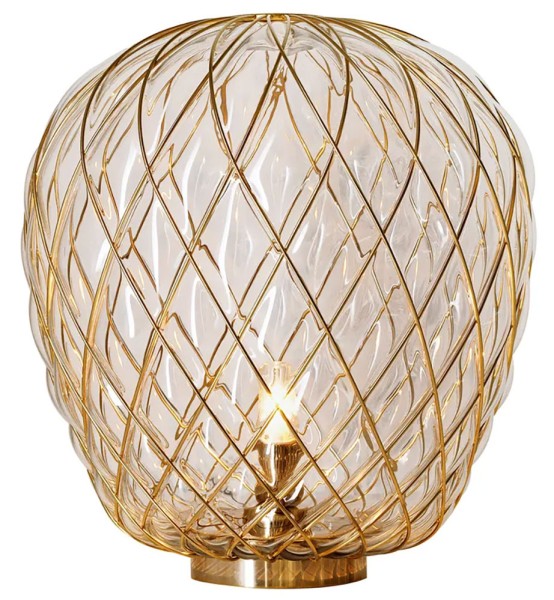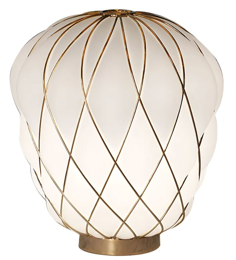 Die Tisch- oder Bodenleuchte Pinecone Grande zählt zur der gleichnamigen Leuchtenserie, die die italienische Designerin Paola Navone 2016 für Fontana Arte entwarf. Die Serie erinnert an historische Leuchten aus den 1940er Jahren, auch die aufwendige Herstellung erfolgt in alter Glasbläserkunst: Der Glasbläser bläst die Glasblase mit dem Mund in einen Metallkorsett, das die natürliche Ausdehnung nur teilweise aufnimmt. Auf diese Weise wird das flüssige Glas teilweise von dem Korsett gehalten und entweicht teilweise, wodurch ein sehr interessantes Spannungsspiel entsteht. Vor allem die transparente Version der Pinecone erlaubt es dem Betrachter, eine doppelte Strukturebene zu erkennen. Im Gegensatz dazu folgt die weiße Version der Leuchte sanft der Korbform und unterstreicht die Geometrien, wobei sich ein elegantes und angenehmes diffuses Licht bildet. Es handelt sich um eine sehr suggestive Leuchte, die sowohl im eingeschalteten als auch im ausgeschalteten Zustand eine starke Wirkung hat. Ehältlich ist die Serie wahlweise als Tisch- oder Pendelleuchte in je zwei Größen und zwei Farbkombinationen.
