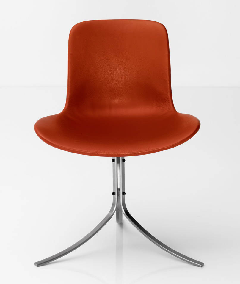 Den dreibeinigen Stuhl PK9 aus rostfreien Flachstahl entwarf Poul Kjaerholm im Jahr 1960, drei Jahre später ergänzte er den Stuhl um den dazugehörigen Esstisch PK54 (siehe unten). Dieses Ensemble ist sicherlich eine der luxuriösesten Essgelegenheiten überhaupt, es fand sich zum Beispiel im Pariser Präsidentenpalast unter Valéry Giscard. Interessant ist auch die Entwurfsgeschichte: Die Anregung zu der Schalenform stammt von einem Abdruck, den Kjaerholms Frau im Sand am Strand hinterließ. Während des späteren Designprozesses saß dann Hanne Kjærholm auf Lehmwürfeln, um so zusammen mit ihrem Mann die optimale und bequemste Lösung zu finden. Erhältlich ist der Stuhlklassiker in ausgewählten Fritz Hansen Lederfarben: