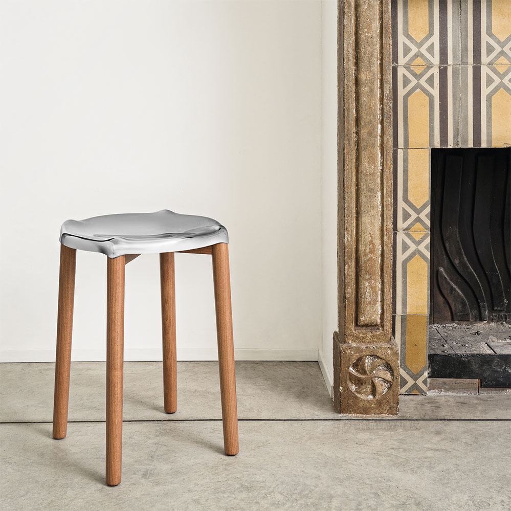Der Poêle Hocker mit einer Sitzschale aus poliertem Edelstahl ist Bestandteil der gleichnamigen Alessi-Serie nach dem Design von Philippe Starck. Zusätzlich ist der Hocker optional in einer günstigeren Variante aus schwarz oder weiß lackiertem Stahl erhältlich, das Gestell ist jeweils dazu abgestimmt aus hellem oder dunkel gebeiztem Buchenholz: