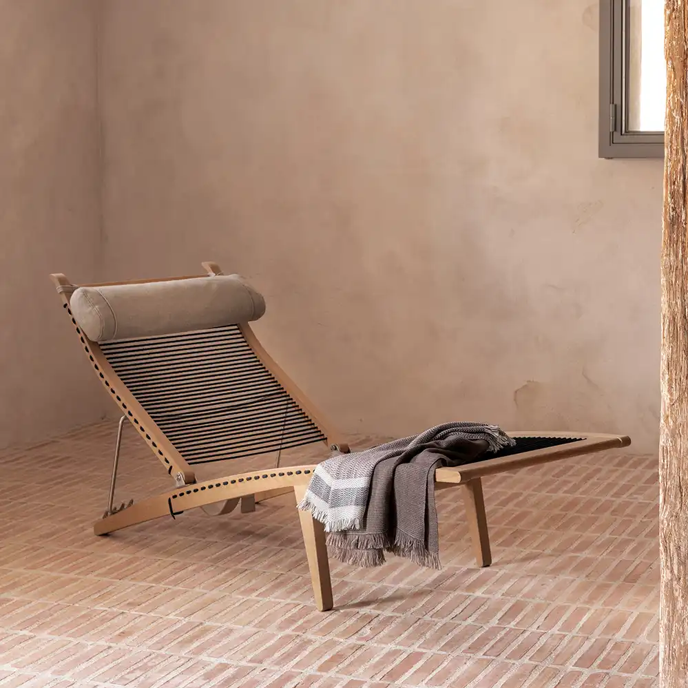 Der Entwurf für den ikonischen Liegesessel PP 524 mit einer Flaggseil-Bespannung entstand im Jahr 1958 und wurde ursprünglich von der dänischen Manufaktur Johannes Hansen produziert. Gefertigt werden alle Hans Wegner Entwürfe von PP Møbler in aufwendigster Handarbeit, erhältlich ist der Liegessesl bei Markanto als Standard in Eiche, weitere Varianten auf Anfrage.