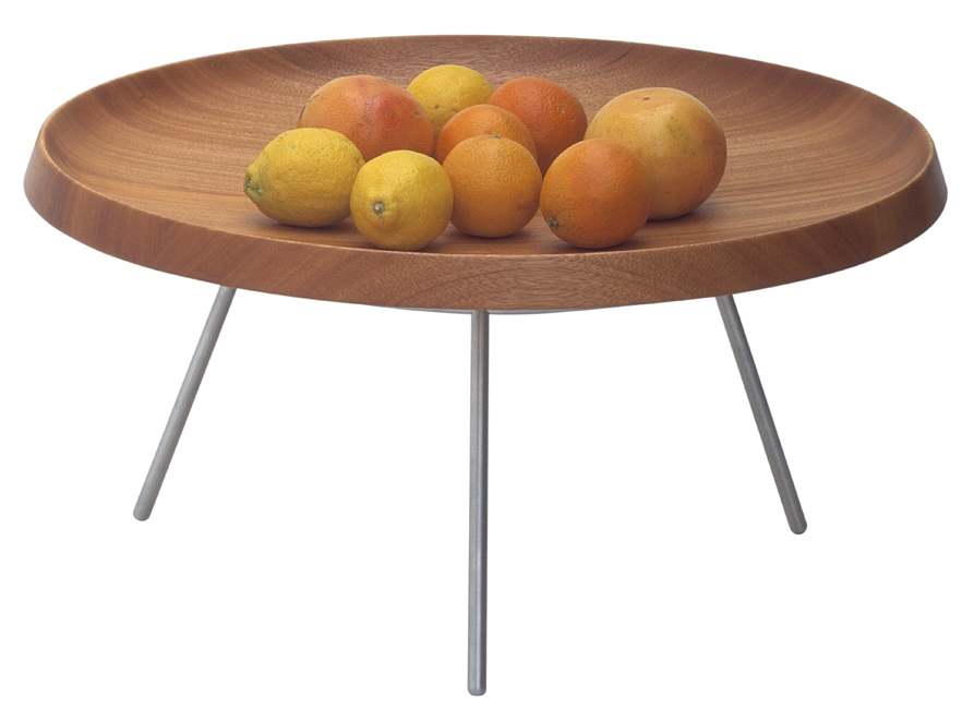 Die PP586 Fruchtschale von Hans Wegner ist eigentlich eine kleiner Beistelltisch, die Lieferung erfolgt inklusive des Untergestells aus poliertem Stahl. Hierbei liegt die Massivholzschale auf dem dreibeinigen Untergestell lose auf. Der Entwurf stammt aus deM Jahr 1956 und dient als praktisches Beistellmöbel. Erhältlich in heller Esche oder rötlicher Kirsche.