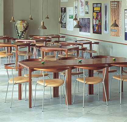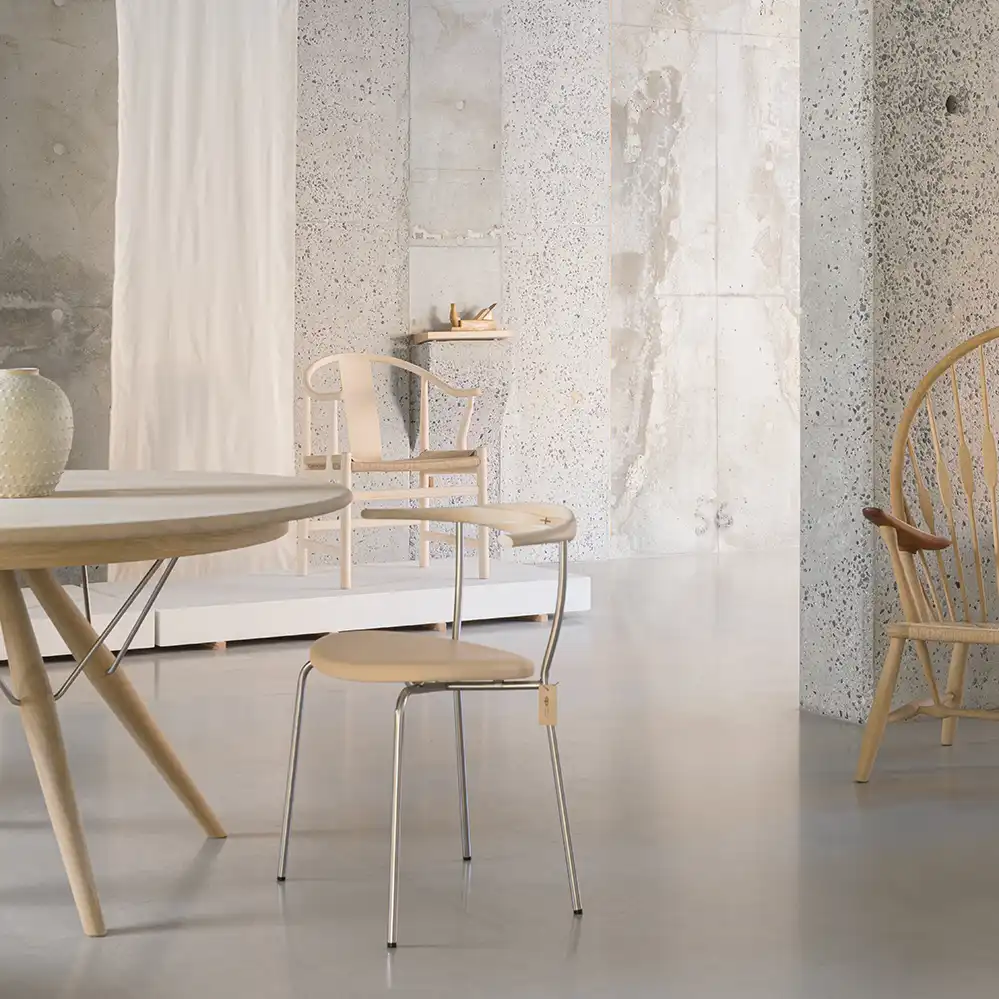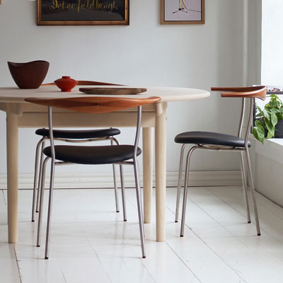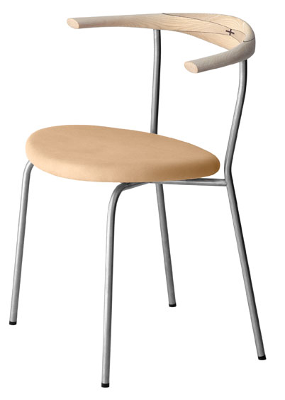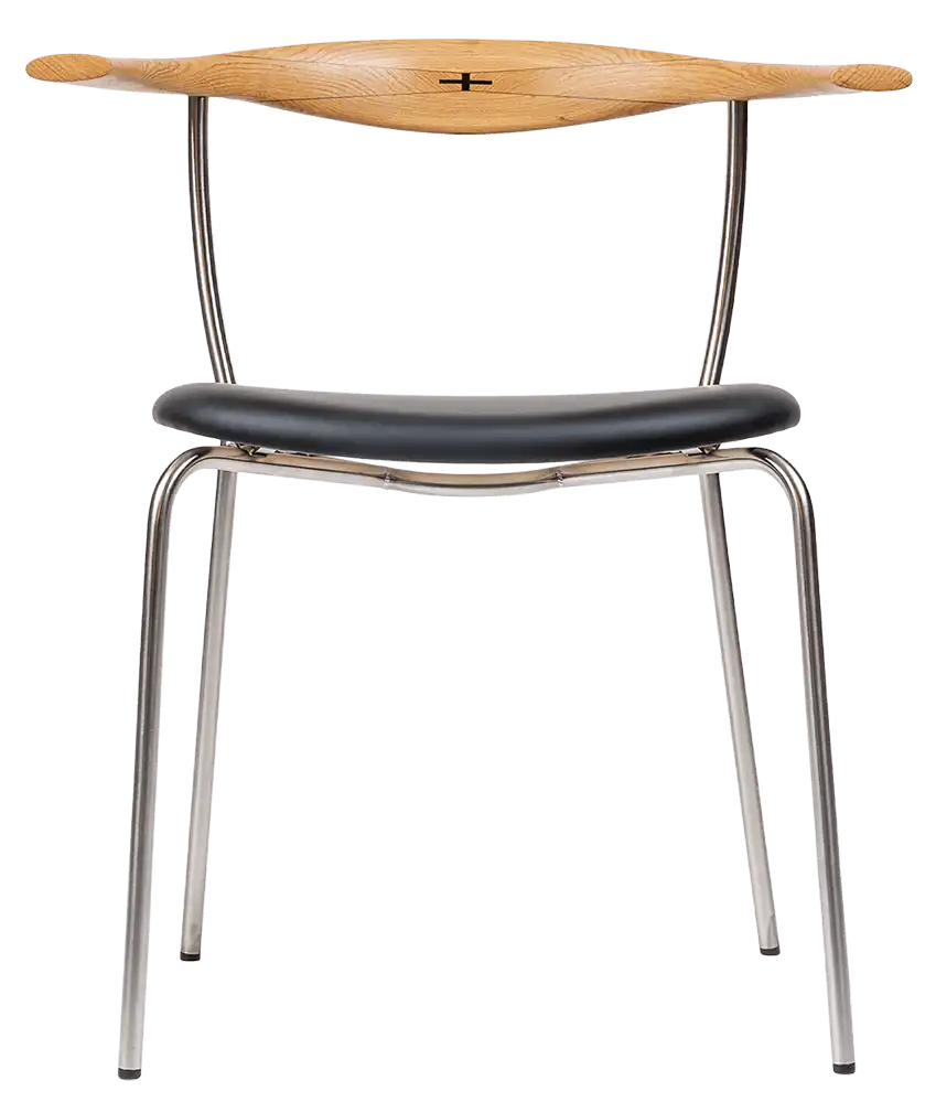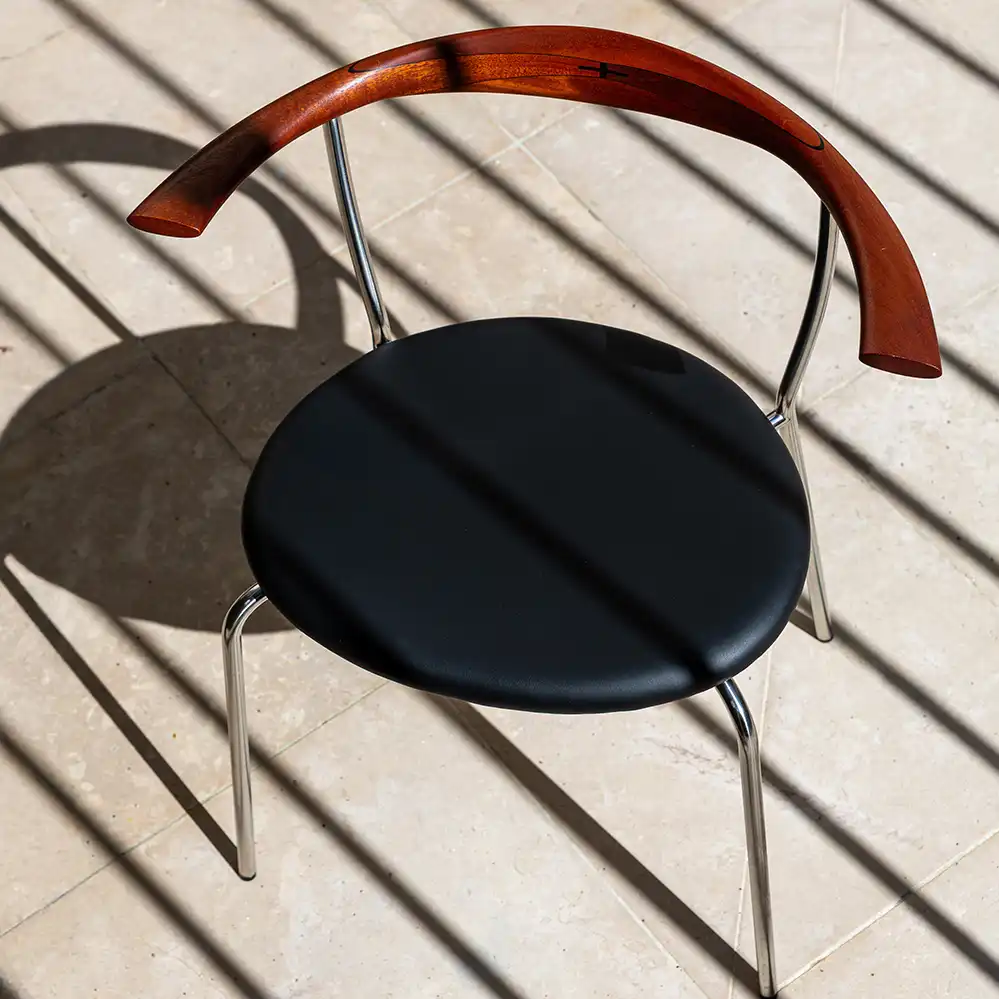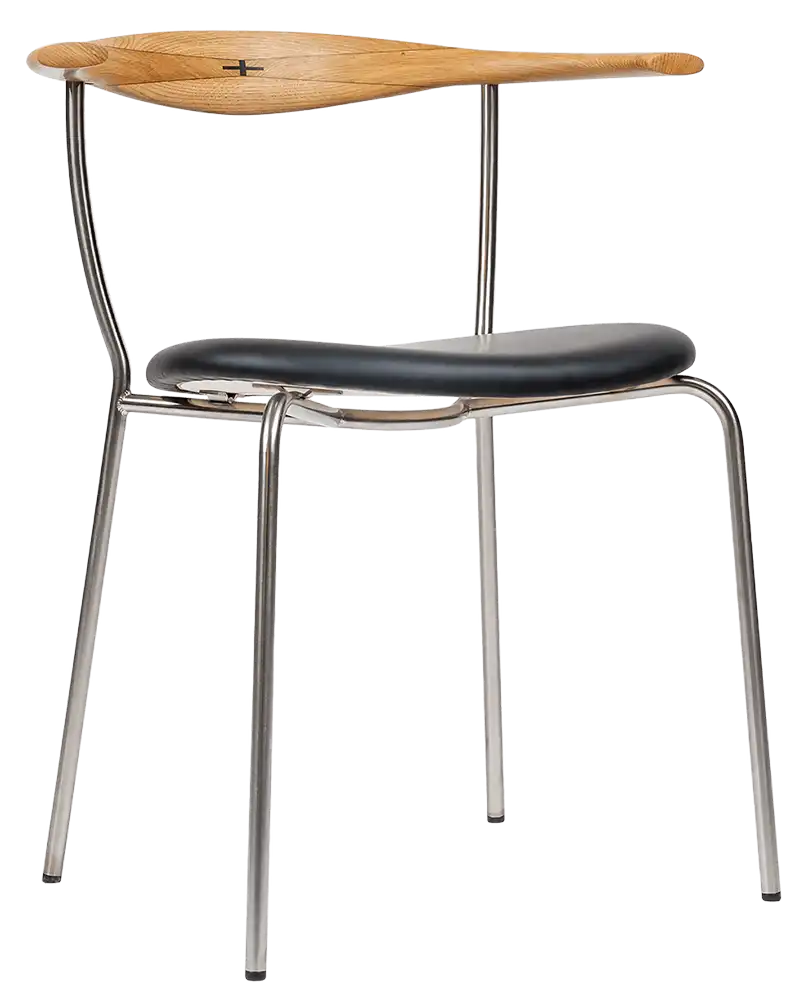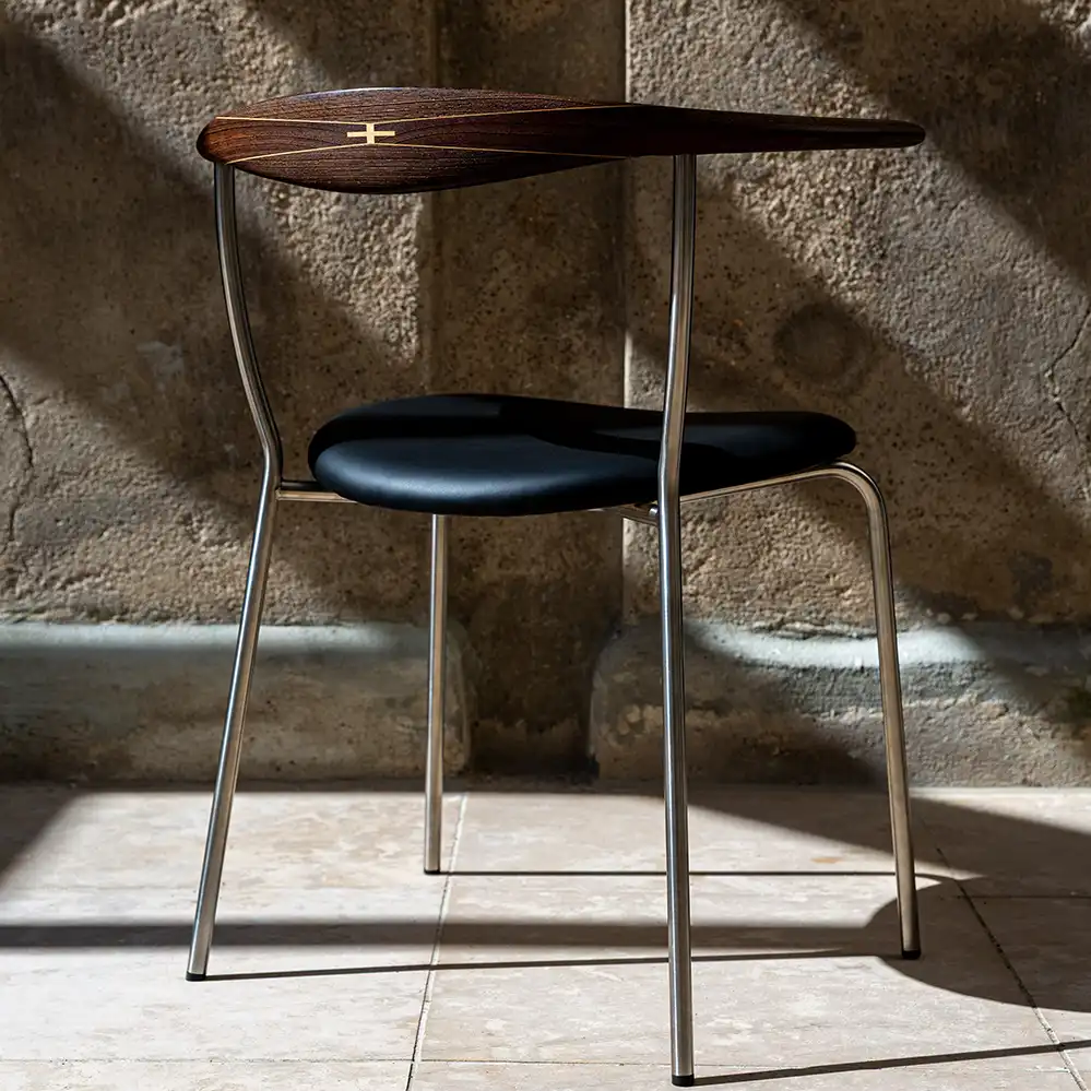Der PP701 Minimal Chair ist ein eleganter Esstischstuhl, den Hans Wegner 1965 für sich selbst, er nutzte ihn als Bestuhlung für seinen Esstisch. Die ausdrucksstarke Kombination von Stahlrohr, Holz und gepolstertem Ledersitz gibt dem Stuhl eine fast transparente Erscheinung. Der Minimal Chair ist dabei einer der wenigen Entwürfe Hans Wegners, die auf Edelstahl basieren. Eine besondere Erwähnung muß noch die Wenge-Intarsienarbeit auf der Rückenlehne finden. Die Mindestbestellmenge beträgt immer zwei Stühle.